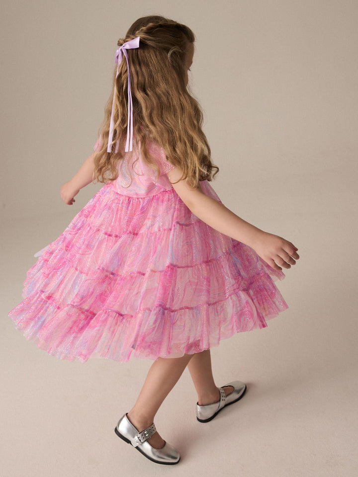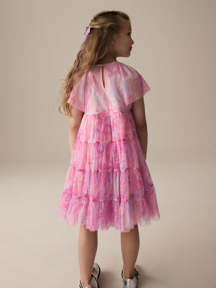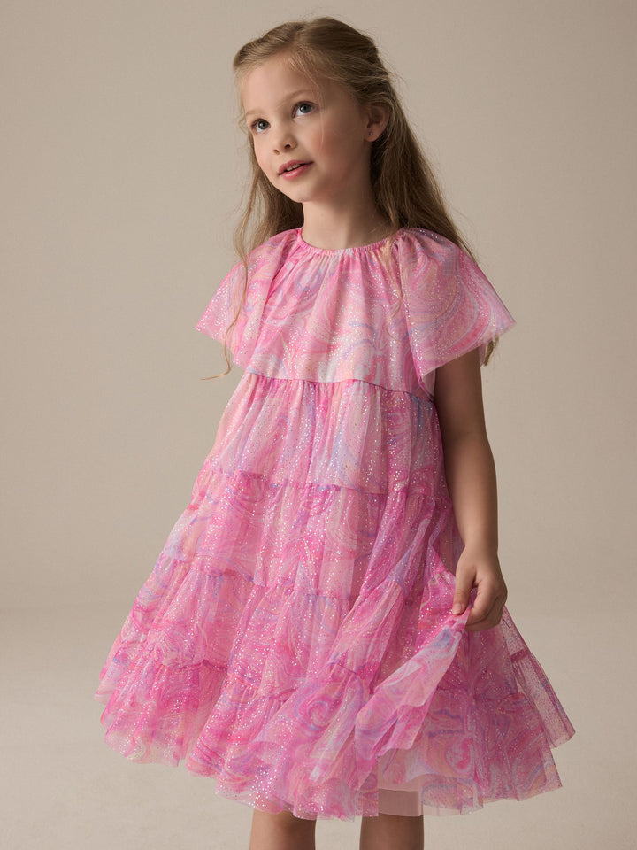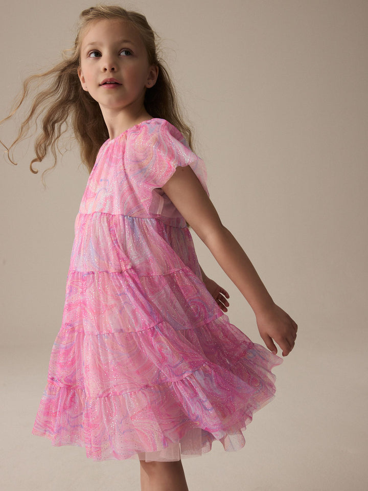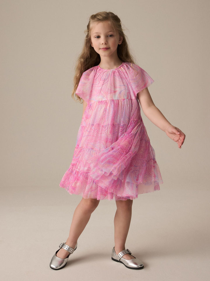 This pretty pink party dress has a tiered mesh skirting with sparkle detailing and a magical swirly print with short ruffle sleeves, perfect for twirling. The dress has a pure cotton lining for comfortable wear. Tiered design Swirly print Sparkle detailing Short ruffle sleeves Cotton lining Outer 100% Recycled polyester. Inner 100% Recycled polyester. Lining 100% Cotton. Country of Origin: India