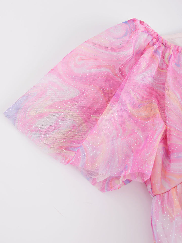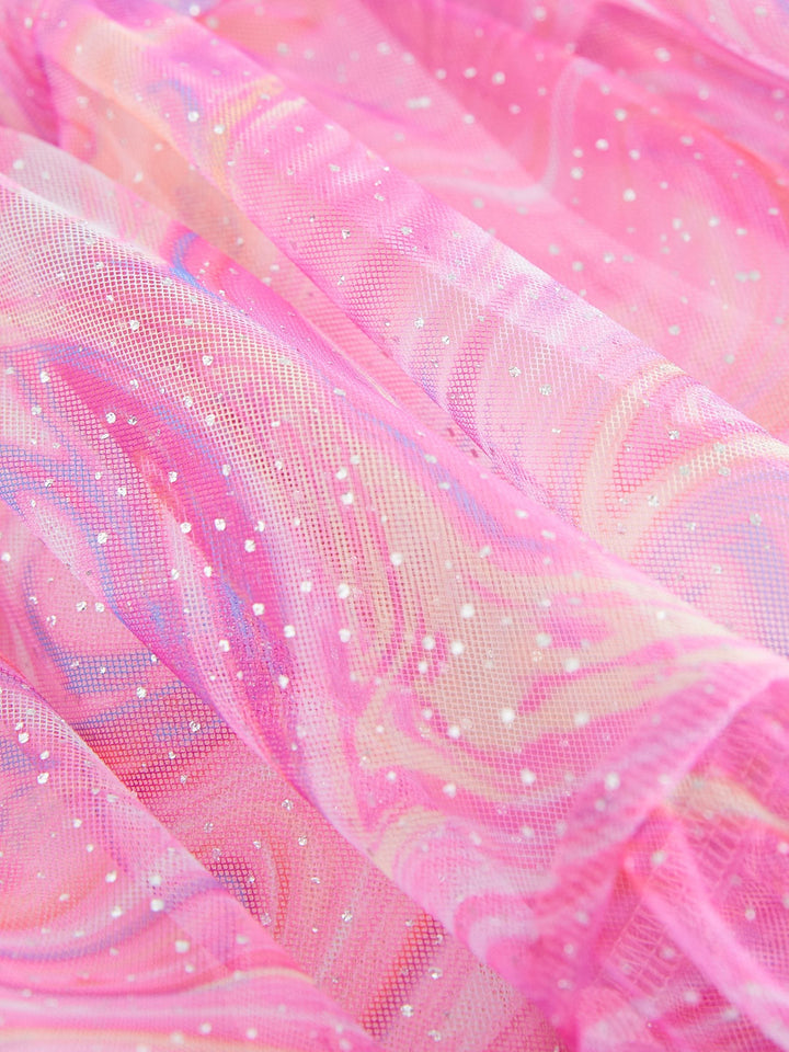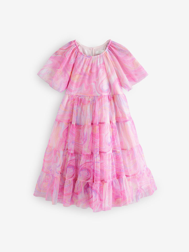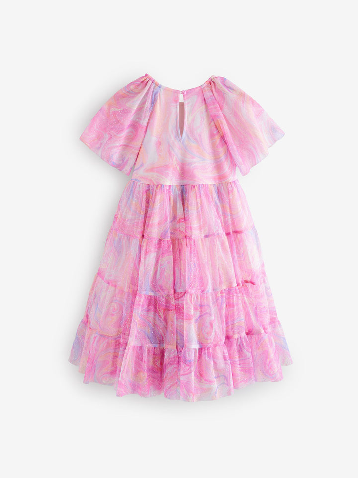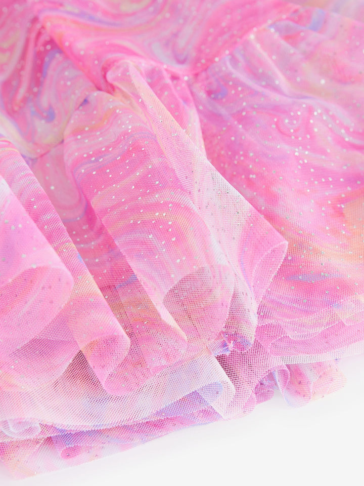 This pretty pink party dress has a tiered mesh skirting with sparkle detailing and a magical swirly print with short ruffle sleeves, perfect for twirling. The dress has a pure cotton lining for comfortable wear. Tiered design Swirly print Sparkle detailing Short ruffle sleeves Cotton lining Outer 100% Recycled polyester. Inner 100% Recycled polyester. Lining 100% Cotton. Country of Origin: India