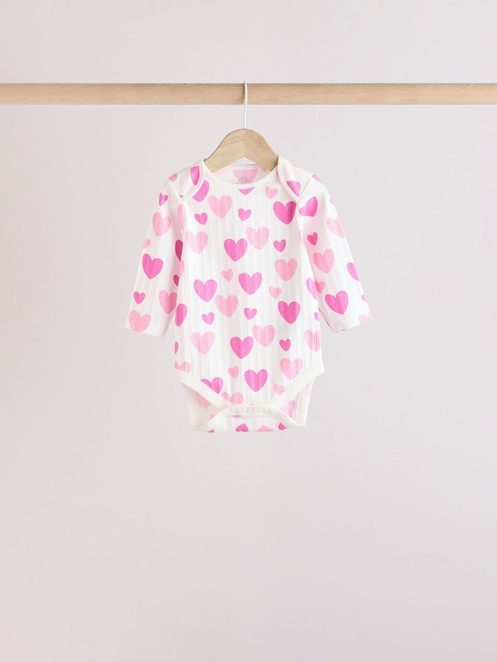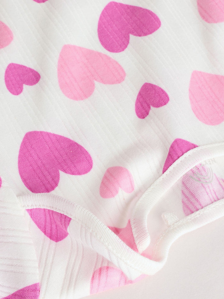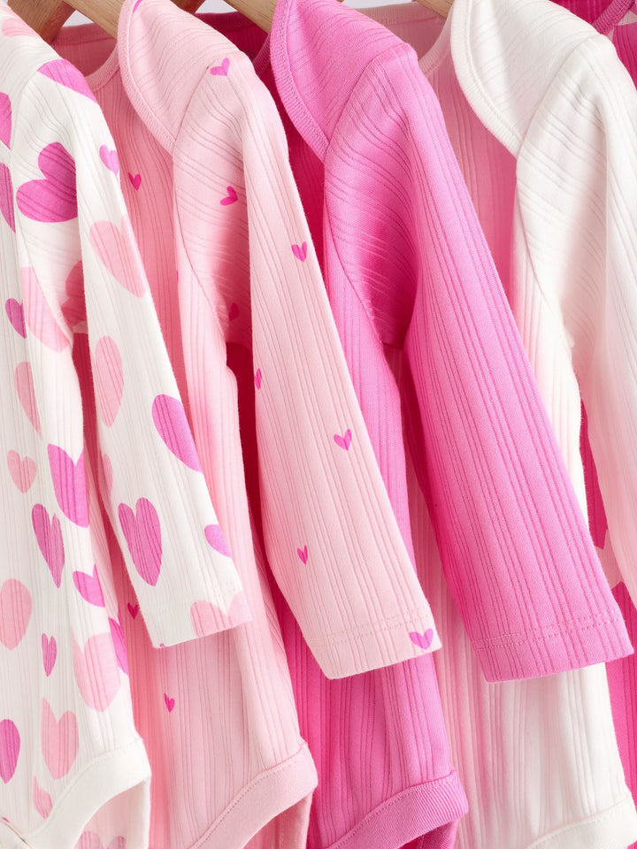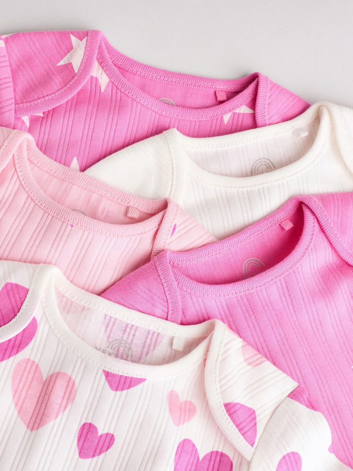 In a handy 5-pack, these ribbed bodysuits are made from pure cotton with all-over heart prints, star prints and plain options. Each bodysuit has an envelope neck opening, a popper bottom fastening and long sleeves. 5-pack 100% cotton Heart and star prints Ribbed texture Popper bottom Long sleeves Machine washable. 5 x Bodysuit 100% Cotton. Country of Origin: Sri Lanka Warning: Keep away from fire and flames.