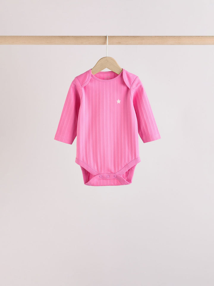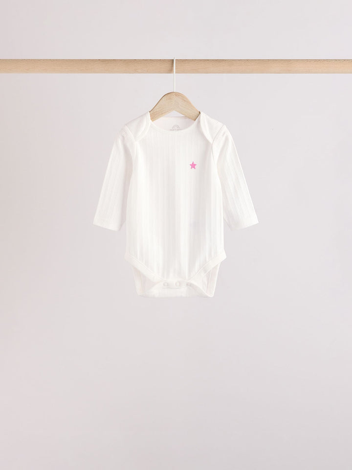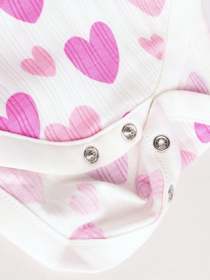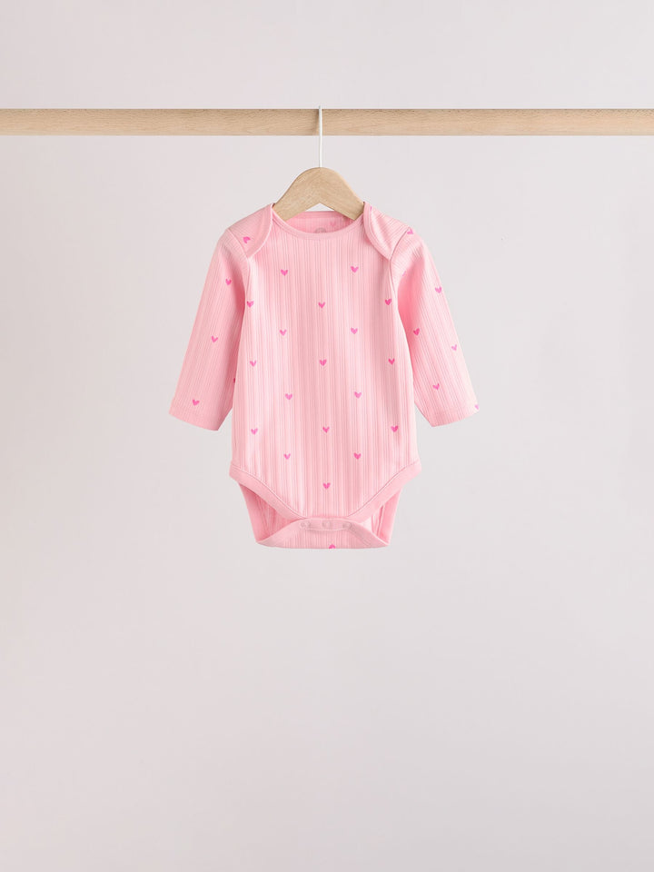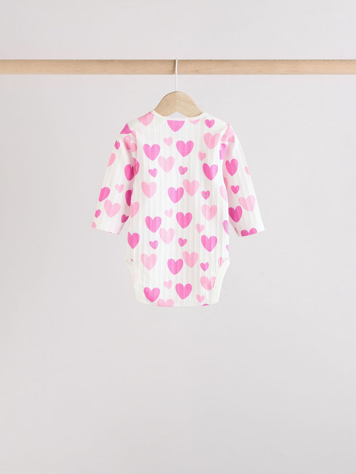 In a handy 5-pack, these ribbed bodysuits are made from pure cotton with all-over heart prints, star prints and plain options. Each bodysuit has an envelope neck opening, a popper bottom fastening and long sleeves. 5-pack 100% cotton Heart and star prints Ribbed texture Popper bottom Long sleeves Machine washable. 5 x Bodysuit 100% Cotton. Country of Origin: Sri Lanka Warning: Keep away from fire and flames.