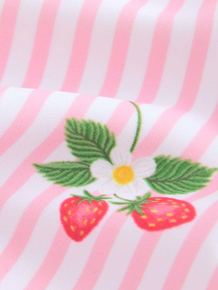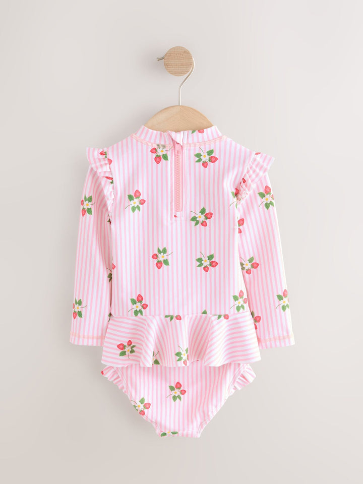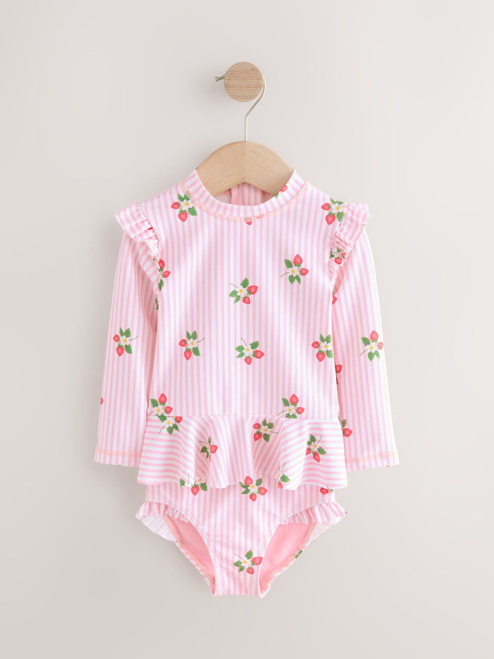 This gorgeous pink strawberry print swim set keeps them safe in the sun without sacrificing style, featuring a long sleeve top with a tall neck, a zip fastening up to ages 12-18 months and ruffle detailing, alongside a pair of matching shorts. A UPF rating of 50+ protects against the sun's rays on covered areas. 2-piece set Long sleeve swim top Tall neck Zip fastening Ruffle detailing Matching shorts UPF rating of 50+ Sunsafe Top 82% Recycled polyester, 18% Elastane. Bikini Bottom Main 82% Recycled polyester, 18% Elastane. Lining 92% Recycled polyester, 8% Elastane. Country of Origin: China This fabric will provide protection against solar ultraviolet radiation. It has been independently tested and given a UPF rating of 50+ which blocks more than 97.5% of UV rays. Important Advice: • Sun exposure causes skin damage • Only covered areas are protected • Always use a high protection factor sunscreen on any exposed areas of skin • The protection offered by this fabric may be reduced with use or if stretched or wet • Always rinse in fresh water after each use • Young children should be kept in the shade between 11 and 3 • Don't forget your hat and sunglasses. • Fabric provides UVA +UVB protection from the sun.