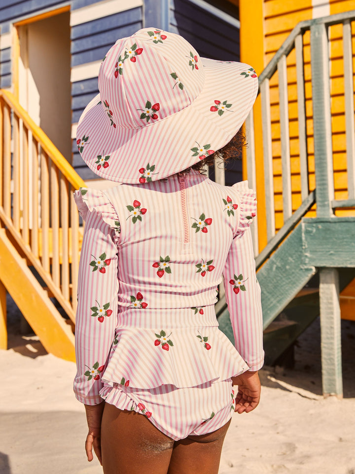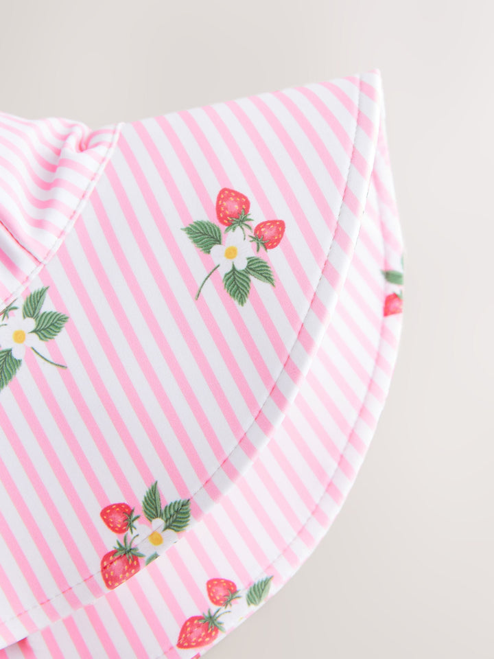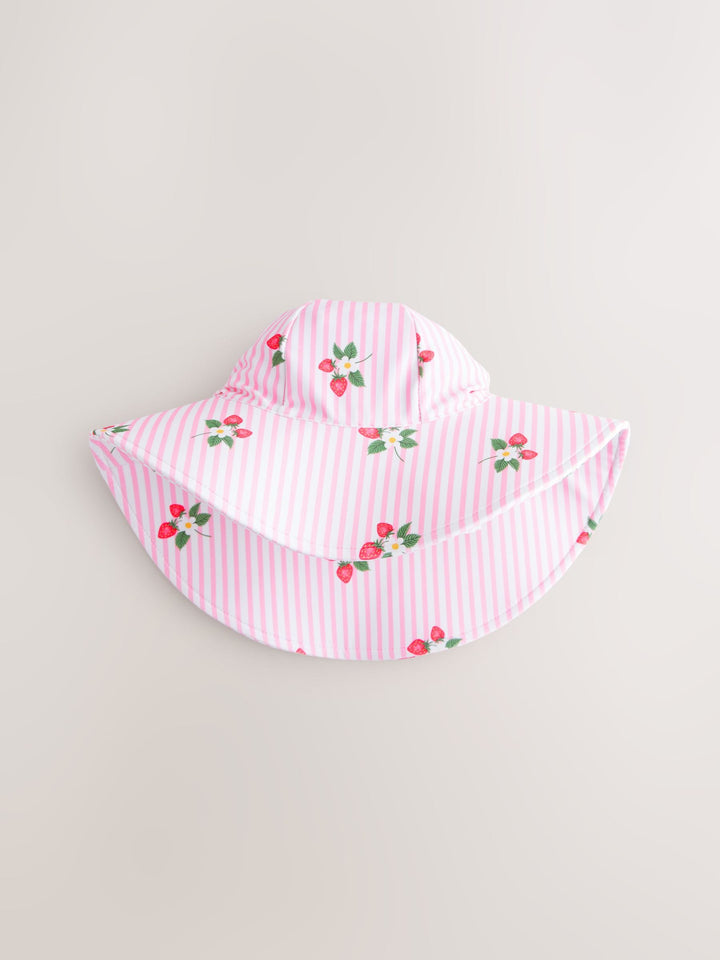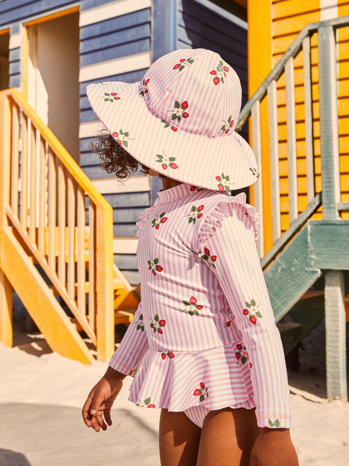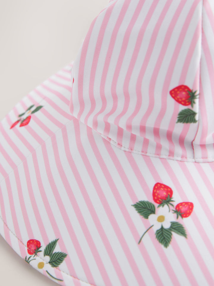 This gorgeous pink strawberry print swim hat adds function and fashion to her look. In a lightweight fabric with a wide brim, it will protect her head from the sun rays and add a trendy touch to her beach looks. Lightweight fabric Strawberry print Wide brim Main 82% Recycled polyester, 18% Elastane. Lining 92% Recycled polyester, 8% Elastane. Country of Origin: China This fabric will provide protection against solar ultraviolet radiation. It has been independently tested and given a UPF rating of 50+ which blocks more than 97.5% of UV rays. Important Advice: • Sun exposure causes skin damage • Only covered areas are protected • Always use a high protection factor sunscreen on any exposed areas of skin • The protection offered by this fabric may be reduced with use or if stretched or wet • Always rinse in fresh water after each use • Young children should be kept in the shade between 11 and 3 • Don't forget your hat and sunglasses. • Fabric provides UVA +UVB protection from the sun.