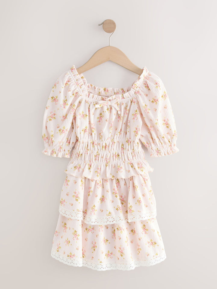 Pink Textured Floral Shirred Bardot Top & Skirt Set (3-16yrs)