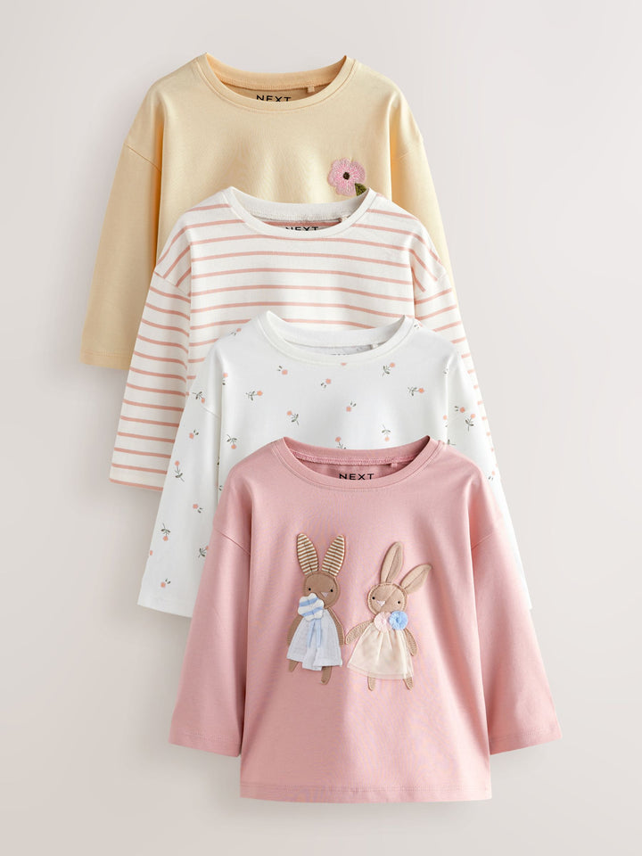 This adorable 4-pack of pure-cotton long sleeve t-shirts feature a 3D bunny rabbit design, an all-over floral print, 3D floral detailing and a striped design, made from pure cotton with a crewneck collar. 4-pack 100% cotton Bunny, floral and stripe designs Crewneck collar Machine washable. 4 x T-shirt 100% Cotton. Country of Origin: Bangladesh