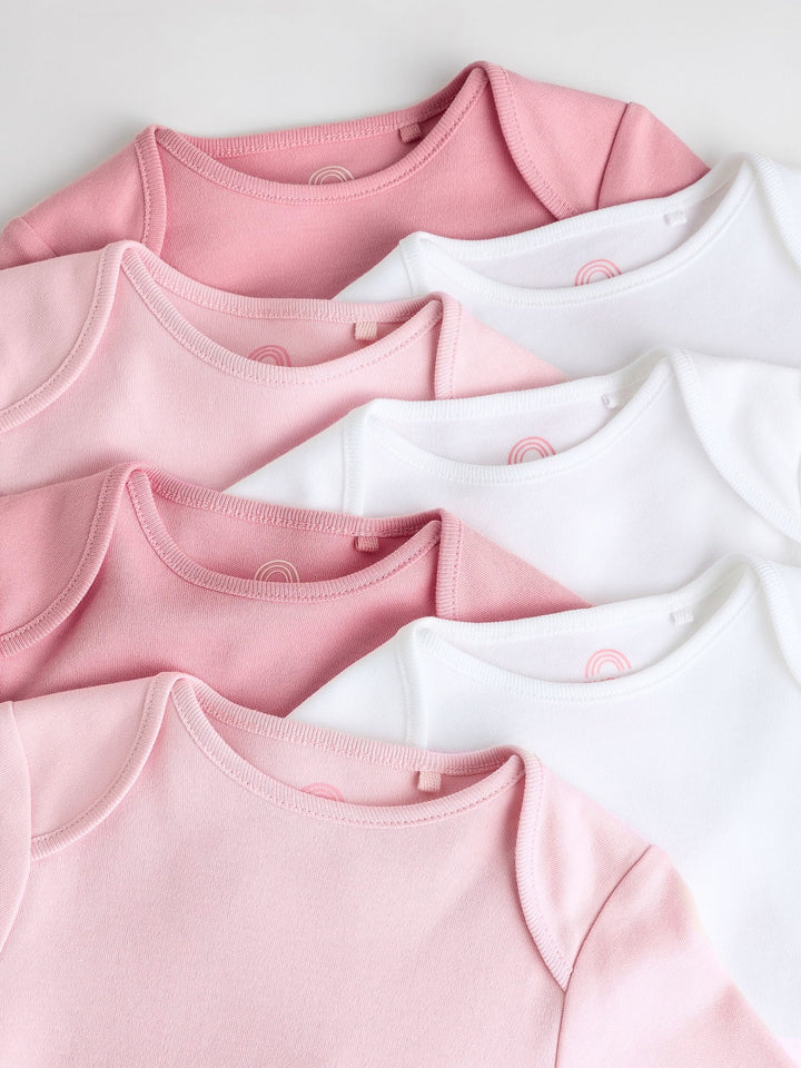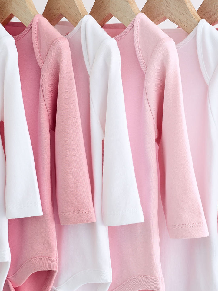 Add our 7-pack of supersoft pink and white cotton long sleeve bodysuits to your baby's essential wardrobe for peace of mind that they'll be comfortable all day long. Designed with nickel-free poppers and printed back neck labels. 7-pack Envelope neck Long sleeves Printed back neck labels Popper fastening between the legs Nickel-free poppers 100% Cotton Machine washable. 7 x Bodysuit 100% Cotton. Country of Origin: India Warning: Keep away from fire and flames.