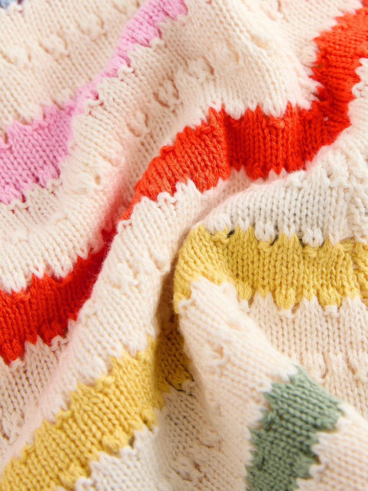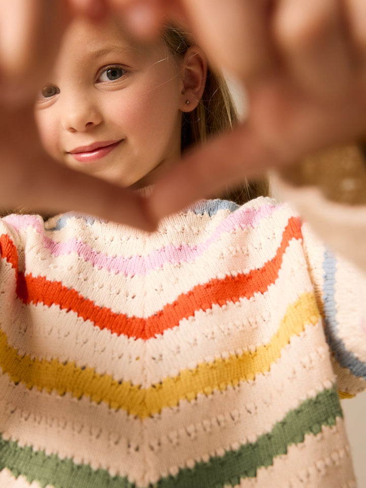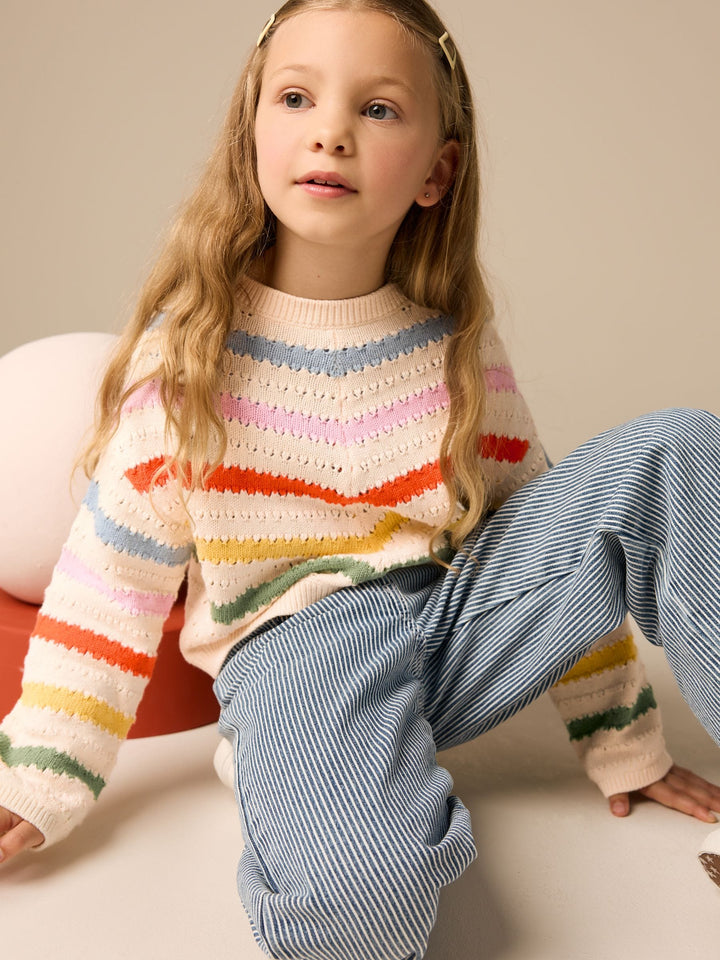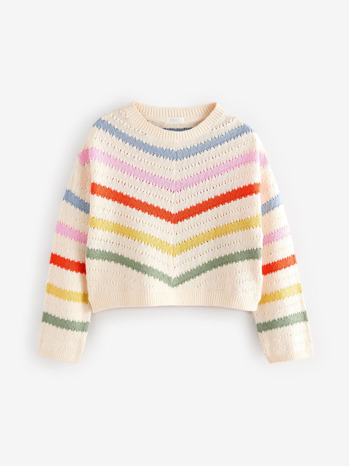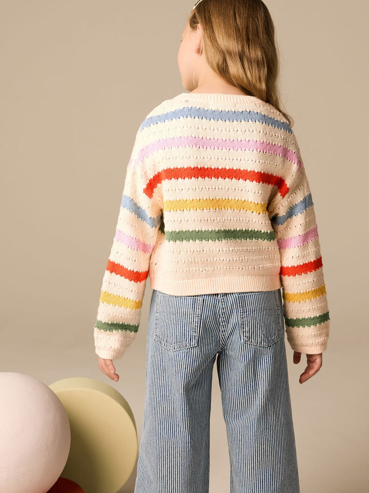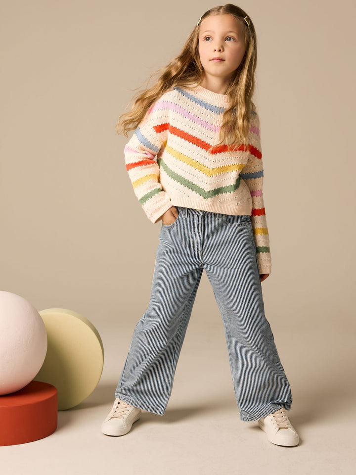 Add a wave of colour to her winter wardrobe with our rainbow jumper. Made from pure cotton, this stylish jumper is cut in a boxy fit for a more relaxed look and is adorned with a colourful stripe design for some extra fun. Pair with jeans and trainers from a trendy look. 100% cotton Rainbow stripe design Boxy fit 100% Cotton. Country of Origin: Bangladesh