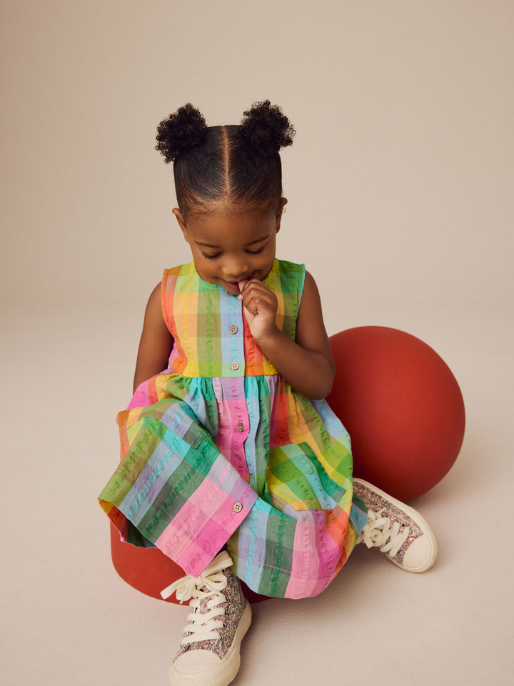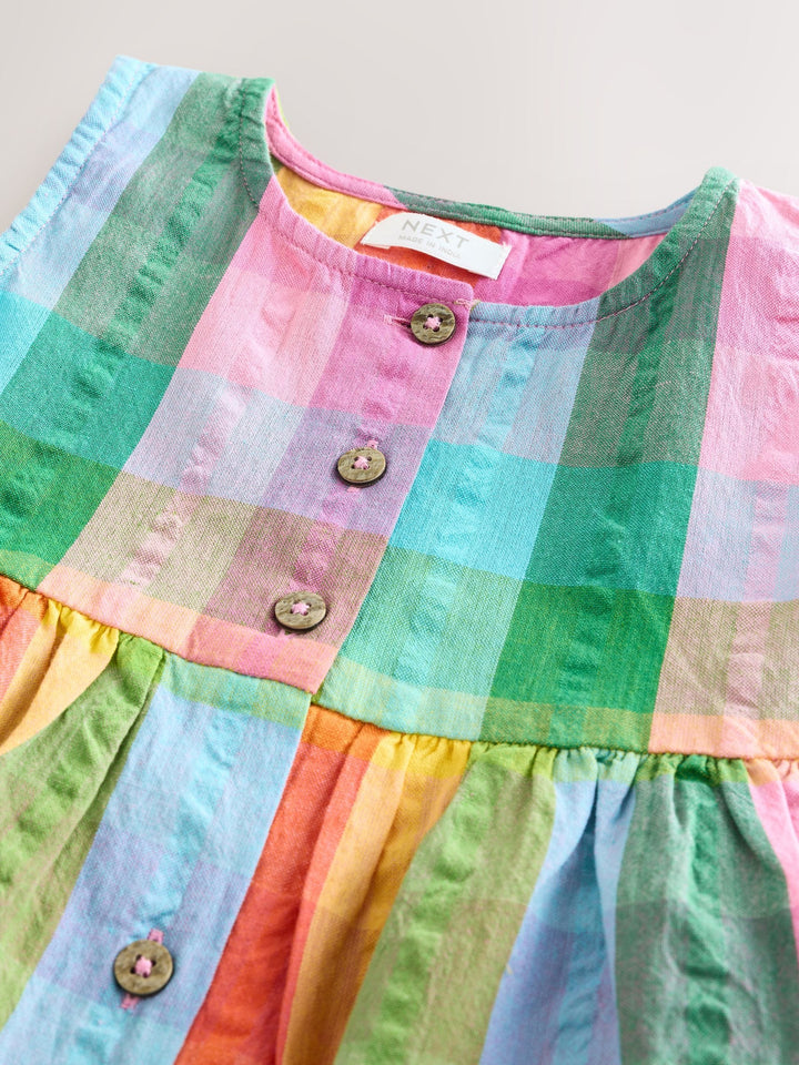 This sleeveless rainbow check dress is perfect for summer, thanks to it's pure cotton construction, featuring a textured finish, a button-up fastening and patch pockets. 100% cotton Sleeveless Button-up Patch pockets 100% Cotton. Country of Origin: India