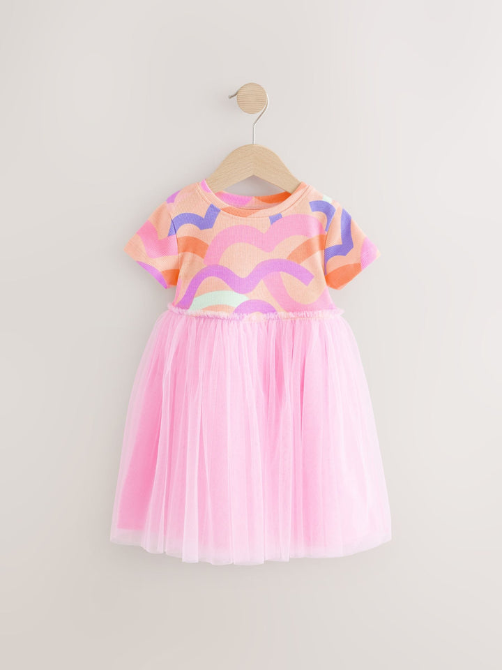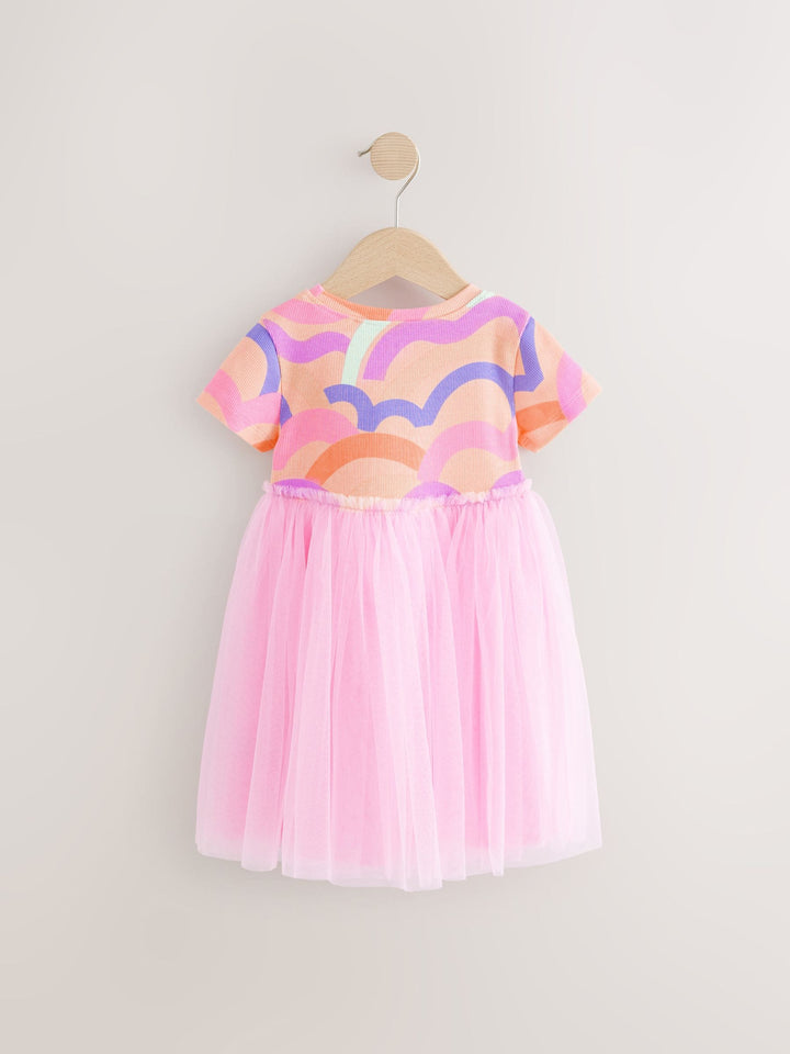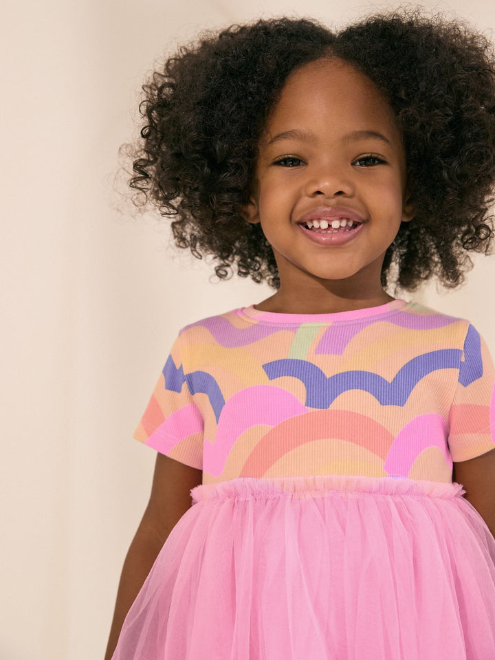 Think pink for her next party with this rainbow pink party dress. The top is made from a cotton rich blend and features a fun wave rainbow design and the skirt is made from a mesh fabric with a full skirt and lining. Pair with sandals or trainers for a complete look Wave rainbow design Cotton rich blend Mesh skirt Fully lined Short sleeves Machine washable. Main 95% Cotton, 5% Elastane. Mesh 100% Nylon. Lining 100% Cotton. Country of Origin: Bangladesh