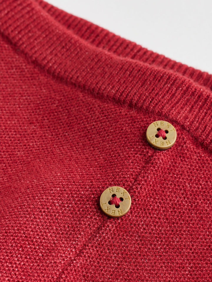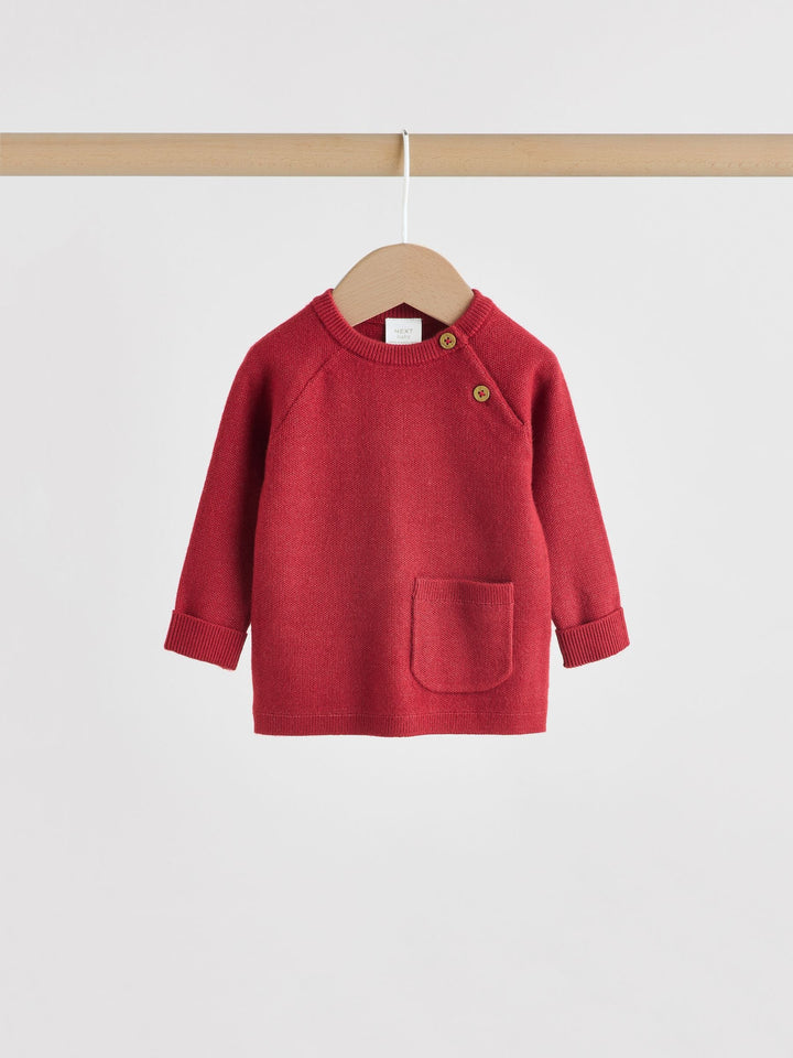 Keep your little one cosy in this charming two-piece red knitted set. The soft knit jumper features a crew neck, shoulder button placket and a patch pocket. With its pull-on leggings, this set is a perfect snuggly addition to their wardrobe. 2-piece set Knitted Crew neck Shoulder button placket Patch pocket Pull-on leggings Machine washable. Jumper and Leggings 55% Viscose, 26% Polyester, 19% Nylon. Country of Origin: Bangladesh Warning: Keep away from fire and flames.