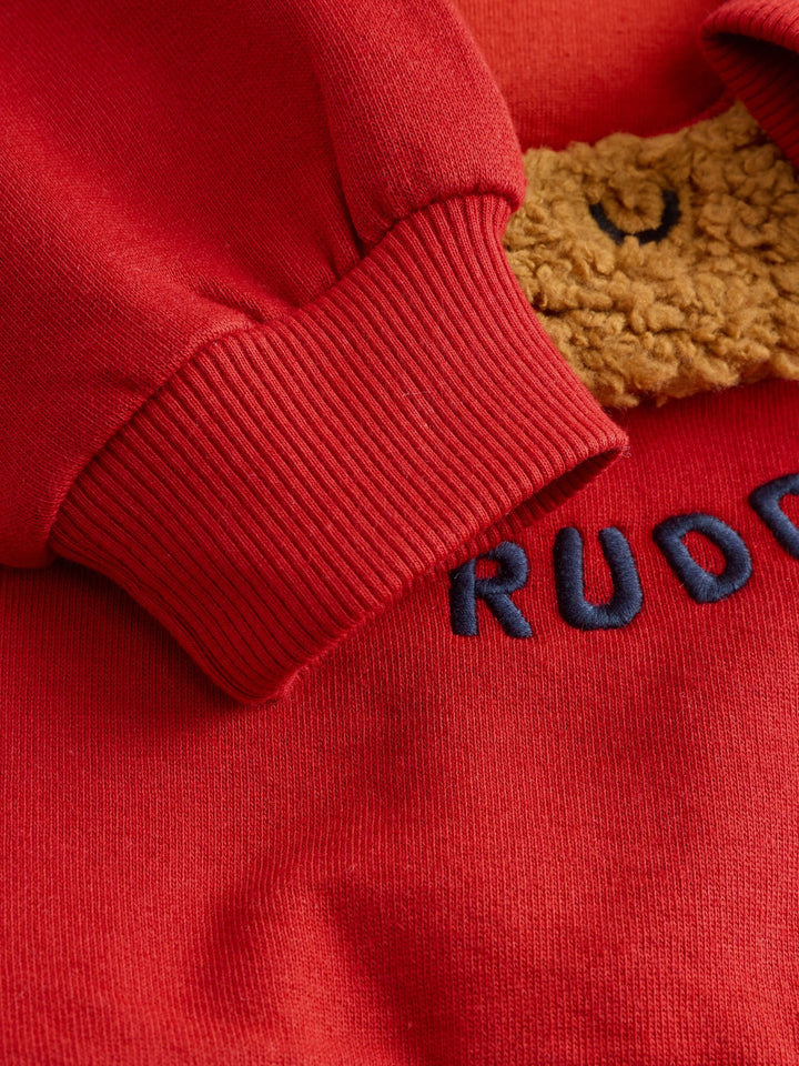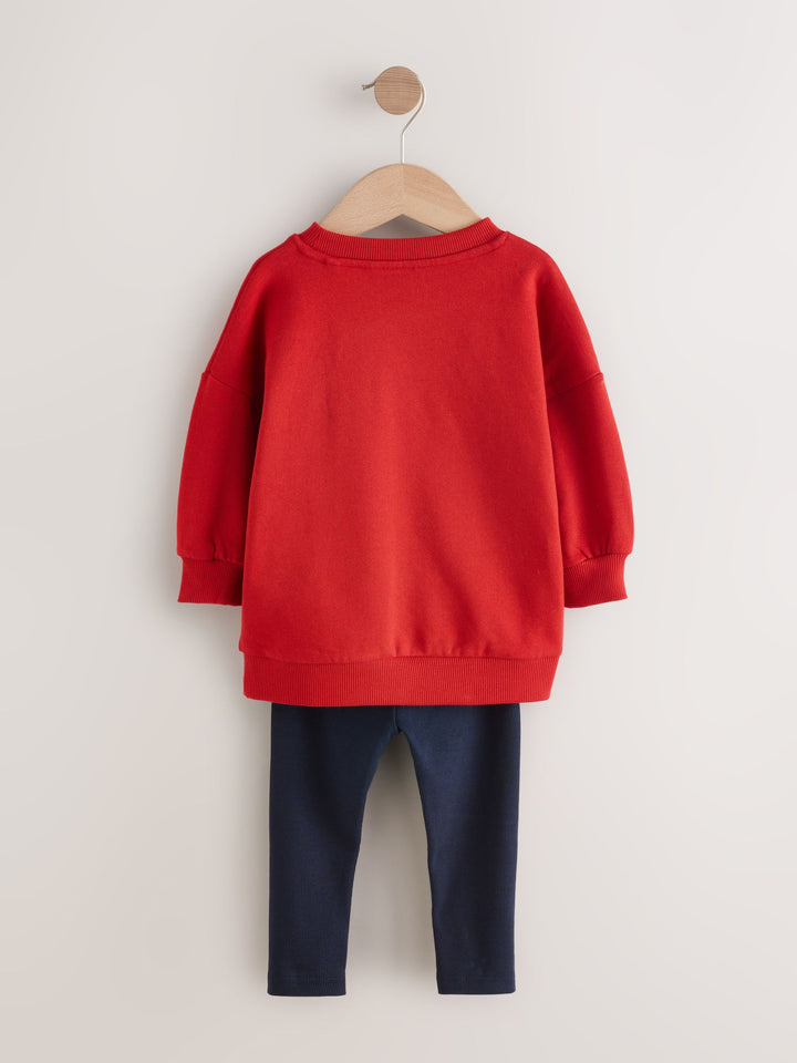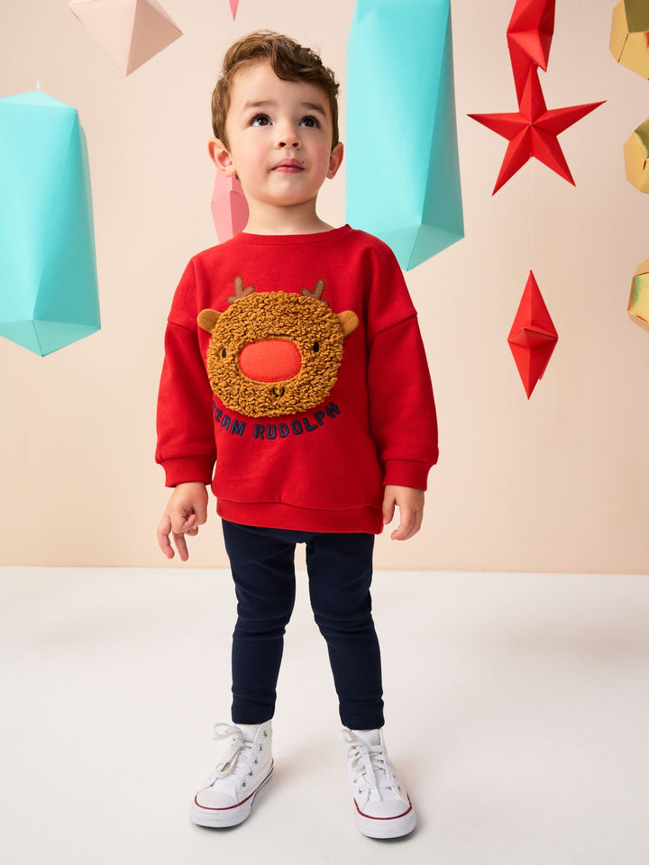 Get into the holiday spirit with the playful Red Boucle Rudolph Christmas Leggings and Crew Set. This festive two-piece outfit features a bright red crew neck sweater adorned with an adorable boucle character appliqué of Rudolph's face, complete with embroidered antlers. Below the character, the sweater proudly displays the embroidered 'Team Rudolph' slogan. The set is completed with comfortable, pull-on navy ribbed leggings, creating a snug and charming look perfect for Christmas parties and family celebrations. 2 piece set Boucle character Christmas design Machine washable. Sweater 100% Cotton. Leggings 95% Cotton, 5% Elastane. Country of Origin: India
