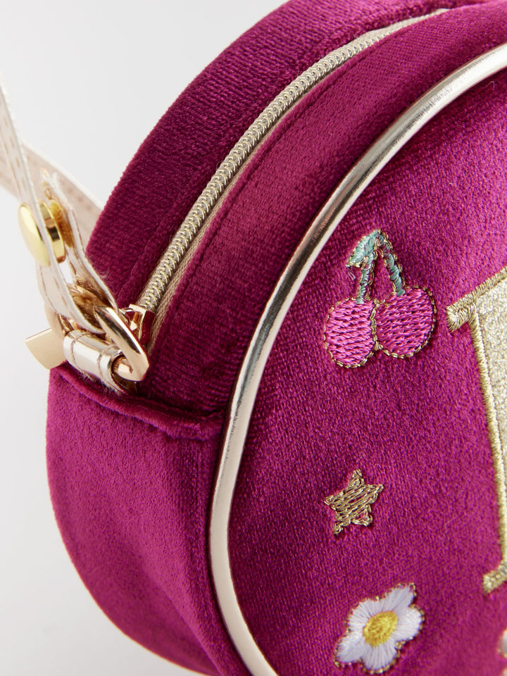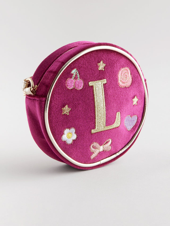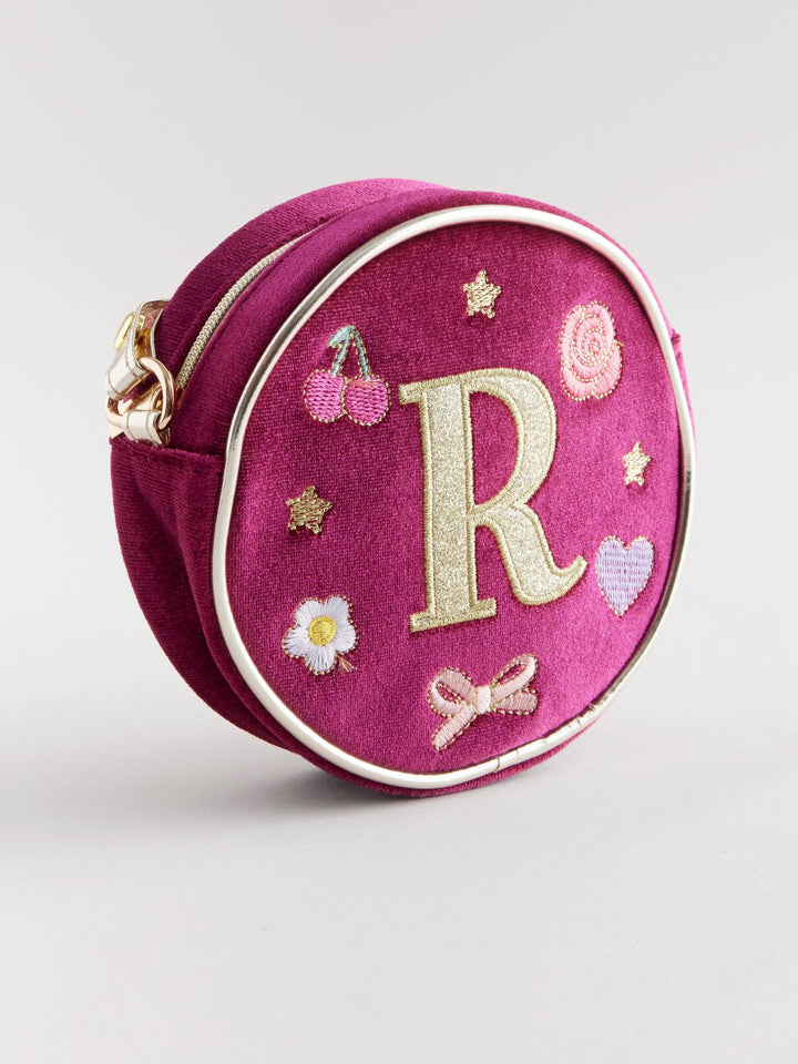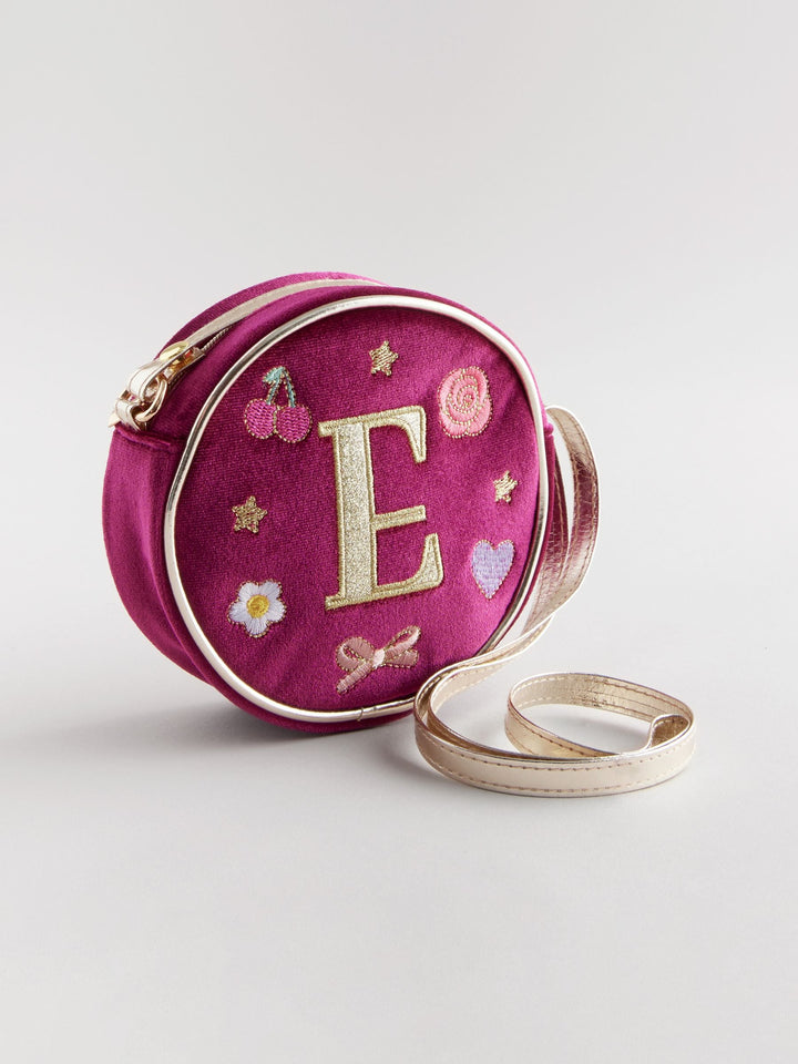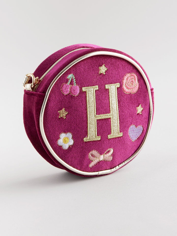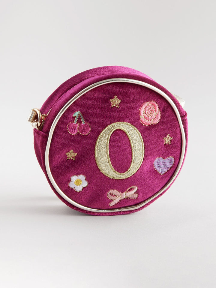 This cute mini-bag is available in a selection of different initials embossed to the front with embroidered detailing, set against a velvet fabric with a zippered compartment and a shoulder strap. Velvet fabric Embroidered initial Zip fastening Shoulder strap Height 14cm Width 14cm Depth 4cm 100% Polyester. Country of Origin: China