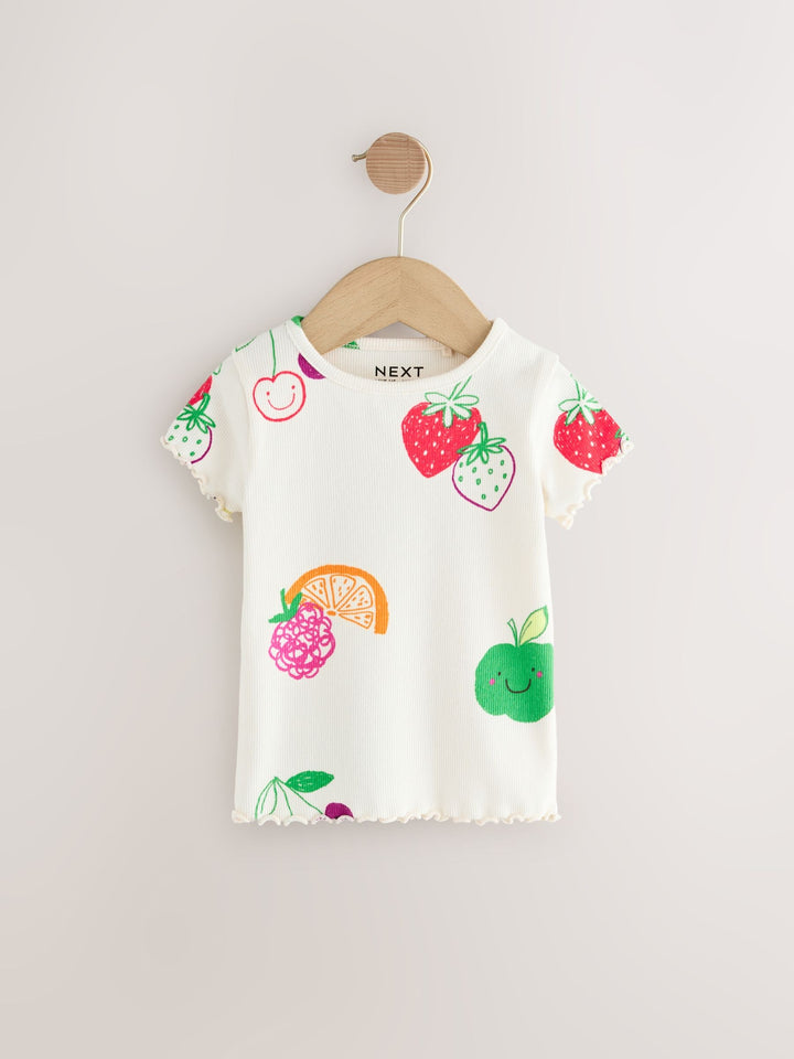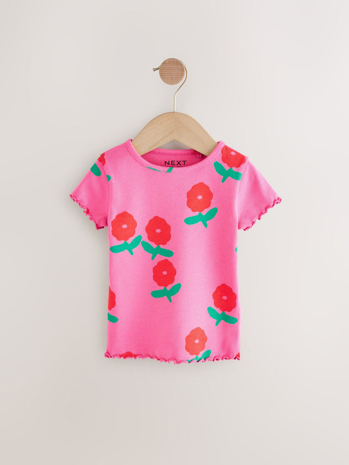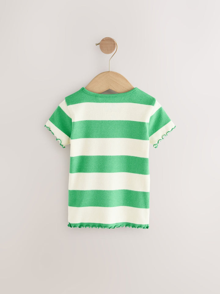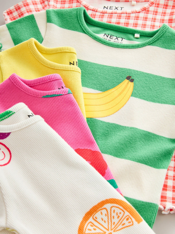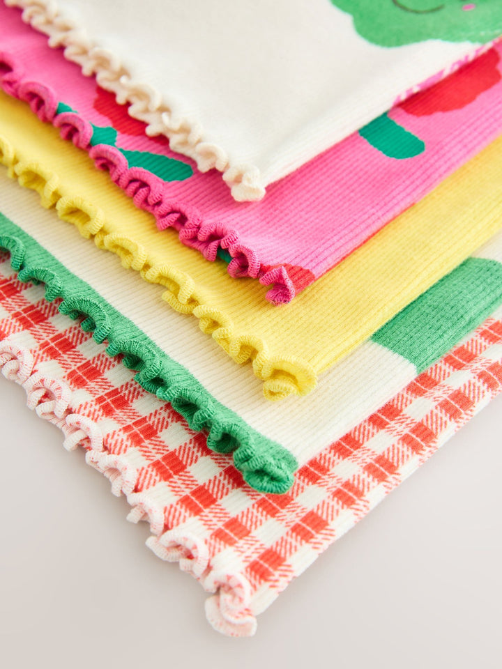 Keep it colourful with this 5 pack of short sleeve t-shirts. Boasting fun and vibrant designs, this set is complete with ribbed detailing and lettuce trim detailing. Pack of 5 Ribbed texture Lettuce trim detailing Machine washable. 5 x T-shirt 95% Cotton, 5% Elastane. Country of Origin: Bangladesh