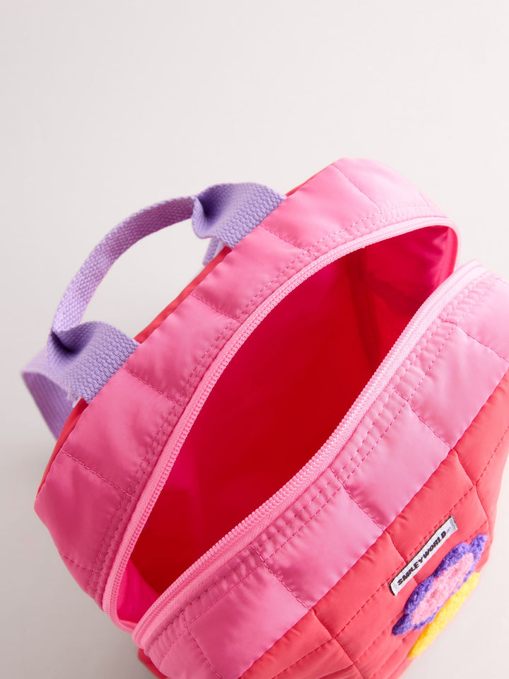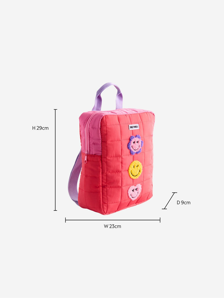 'Bright and colourful quilted rucksack with iconic smiley needle punch patches. Adjustable straps plus carry handle.Warning! Choking And Strangulation Hazard Not Suitable For Children Under 36 Months Due To Small Parts And Long Straps Height 29cm Width 23cm Depth 9cm Polyester Height 29cm Width 23cm Depth 9cm 100% Polyester. Country of Origin: China