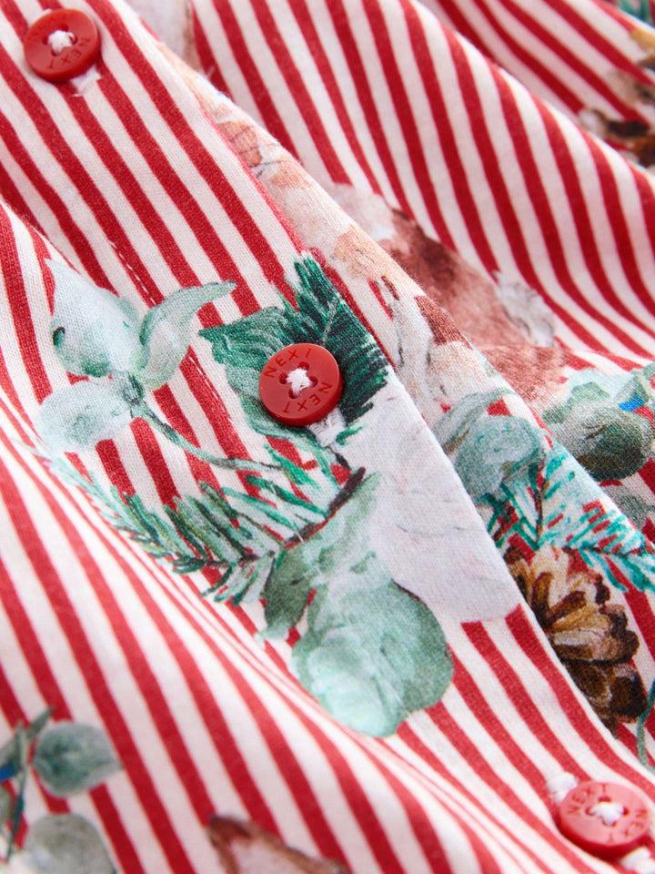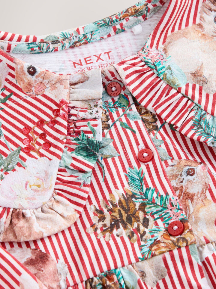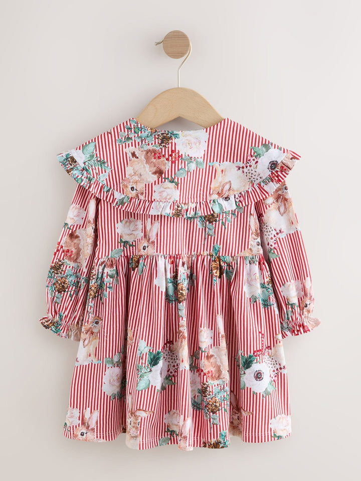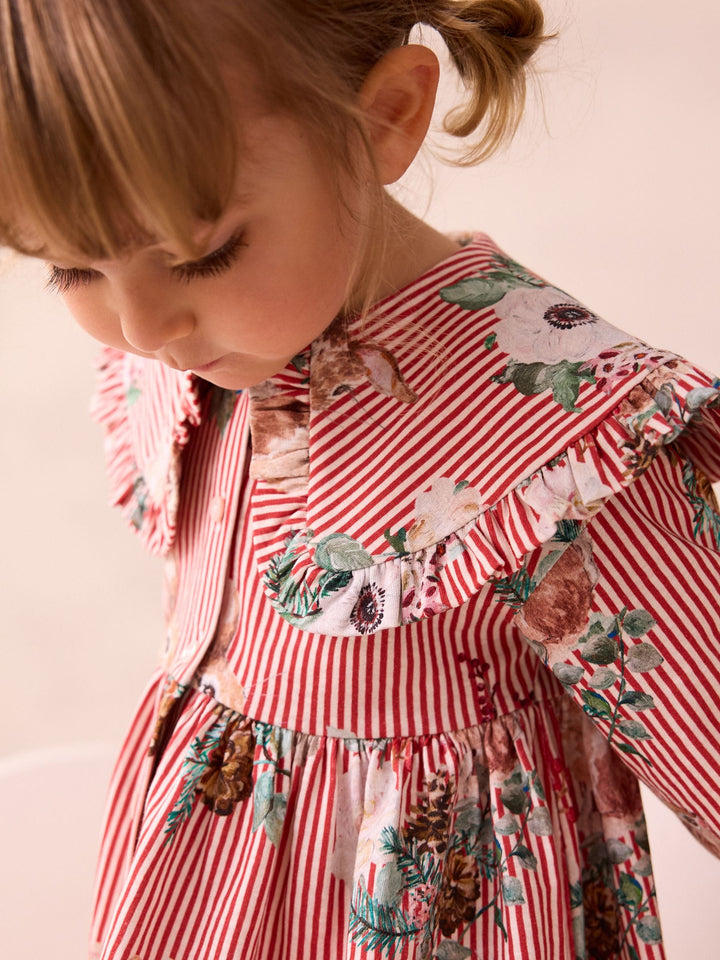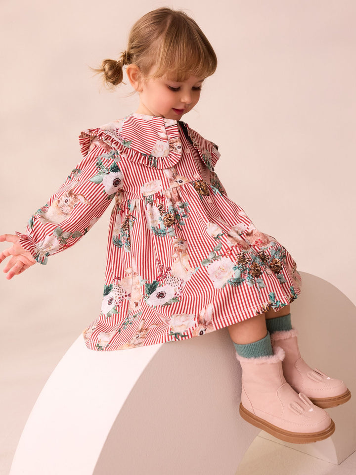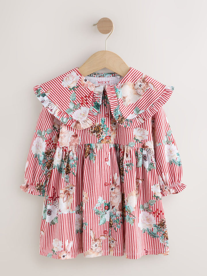 This adorable red stripe dress features collared detailing, made from a textured fabric with ruffle trims and a front button fastening, finished with long sleeves. Collar detailing Textured fabric Long sleeves Ruffle trim Button fastening Machine washable. 100% Cotton. Country of Origin: Bangladesh