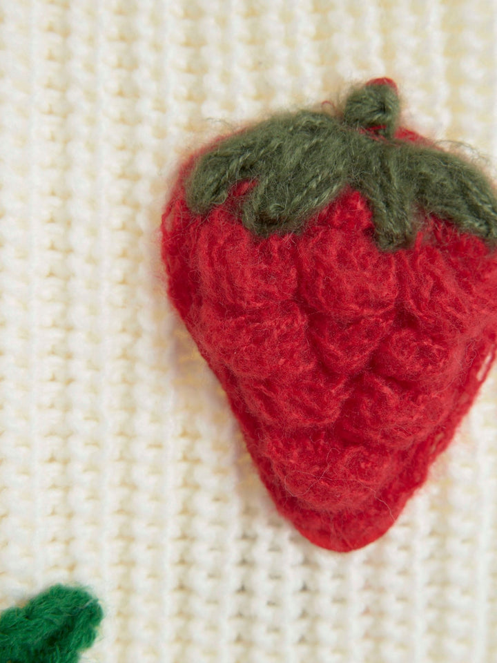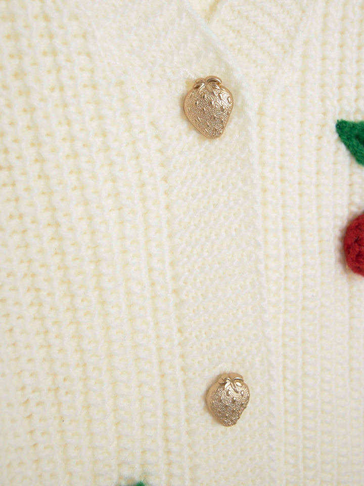 V-Neck Knitted 3D embroidered fruit graphics Buttoned fastening Long sleeves Washable. 100% Acrylic. Country of Origin: China