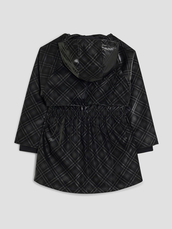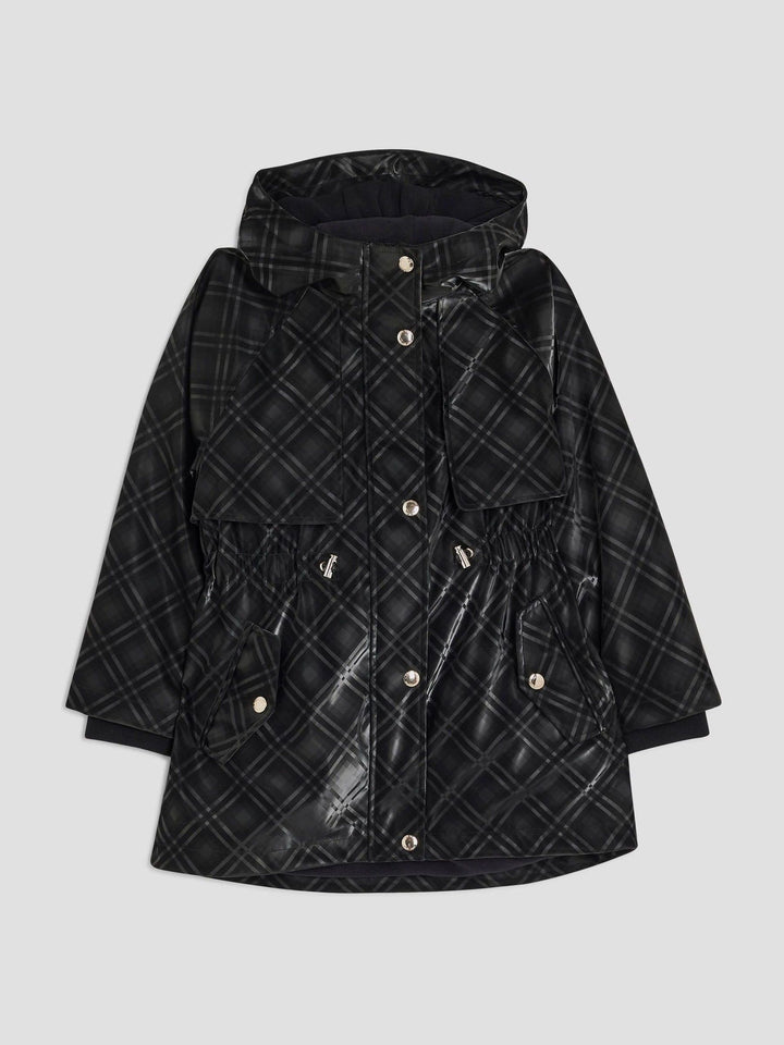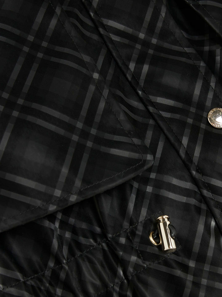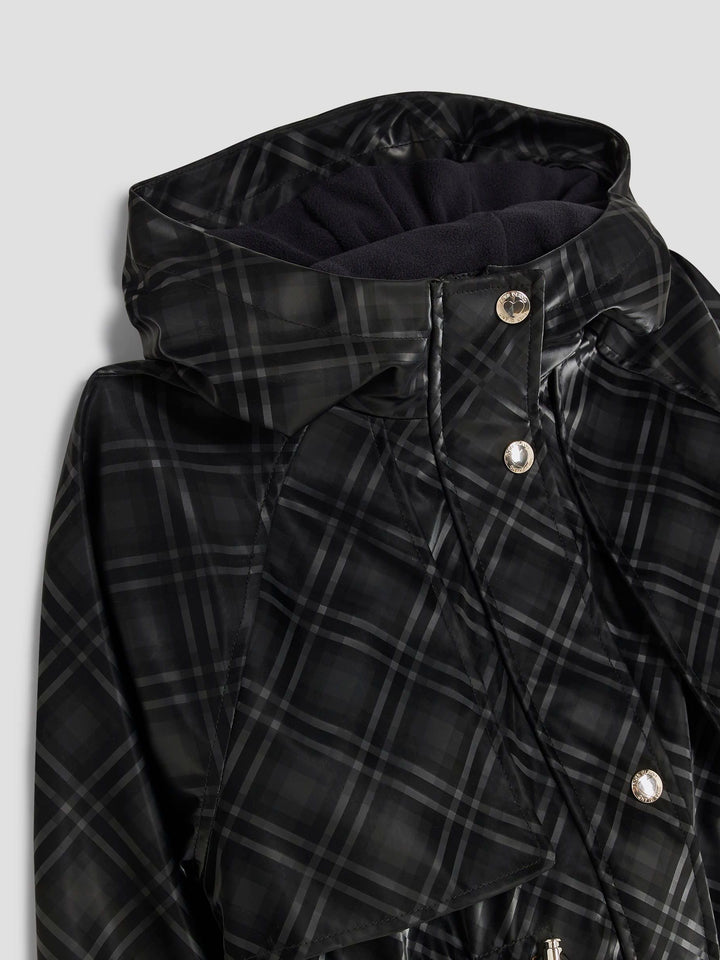 Fleece lined Showerproof Hooded Chequered print Buttoned pockets Cinched waist Long sleeves Stud pressed and zipped fastening Washable. 100% Polyester. Country of Origin: Great Britain