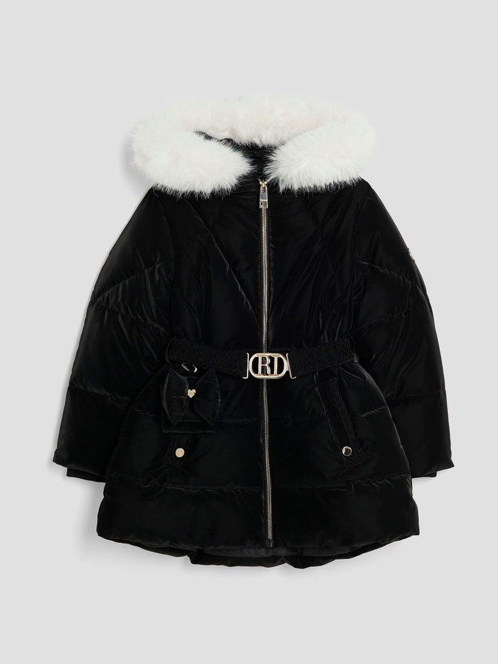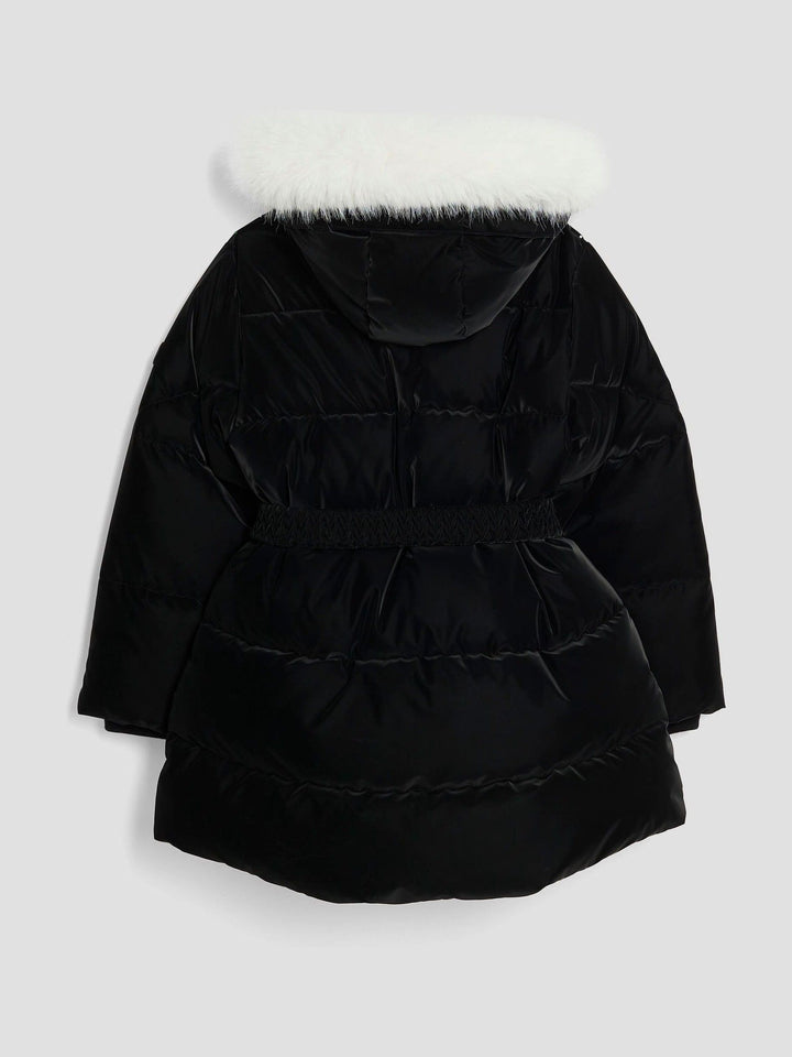 Faux fur hooded Padded Belted Side slip pockets Zipped fastening Long sleeves Heavyweight 100% Polyester. Country of Origin: China