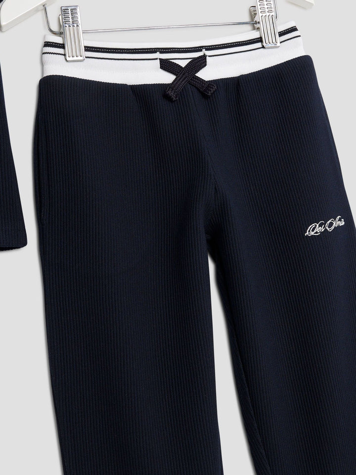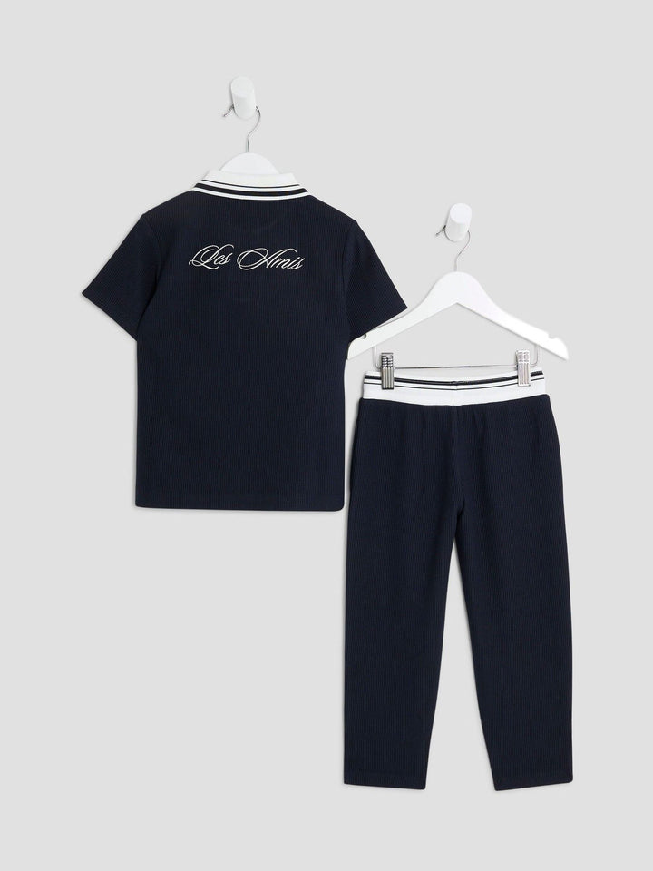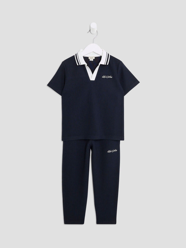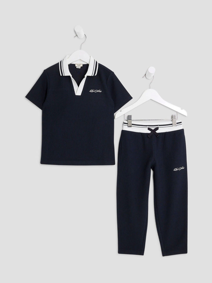 Set of 2 Polo shirt Open neck collar Textured Embroidered graphic Short sleeves Joggers Side slip pockets Elasticated drawstring waistband Washable. 70% Polyester, 27% Viscose, 3% Elastane. Country of Origin: Great Britain