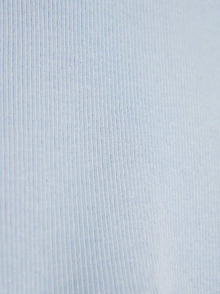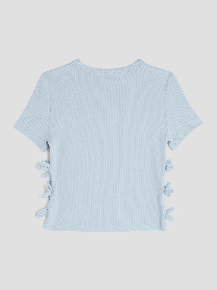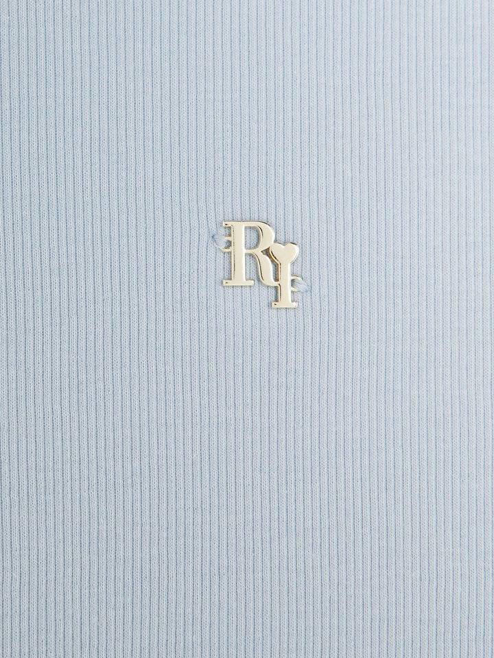 Crew neck Metal RI hardware Blue Ribbed Side bow detail Short sleeves Lightweight Washable. 97% Cotton, 3% Elastane. Country of Origin: Turkey
