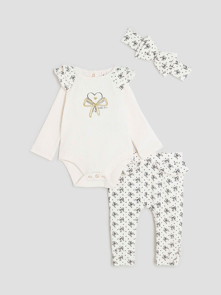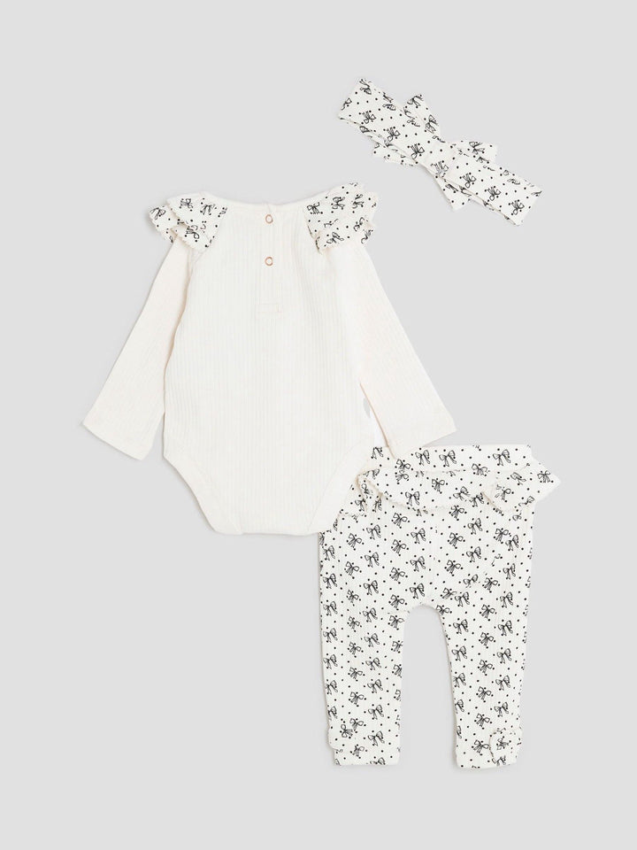 3 piece set Bodysuit, headband and leggings Ribbed fabric Bow print Round neckline Long sleeves Embroidered graphic Ruffle detail Popper fastening Machine washable. 95% Cotton, 5% Elastane. Country of Origin: Bangladesh