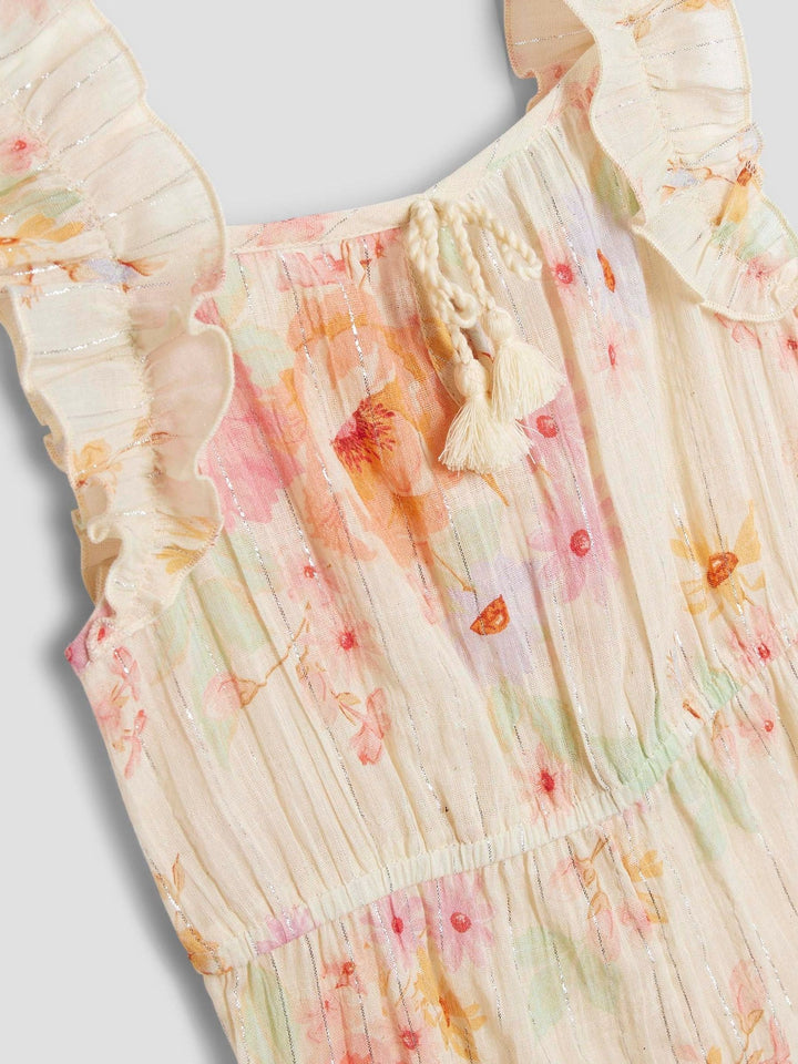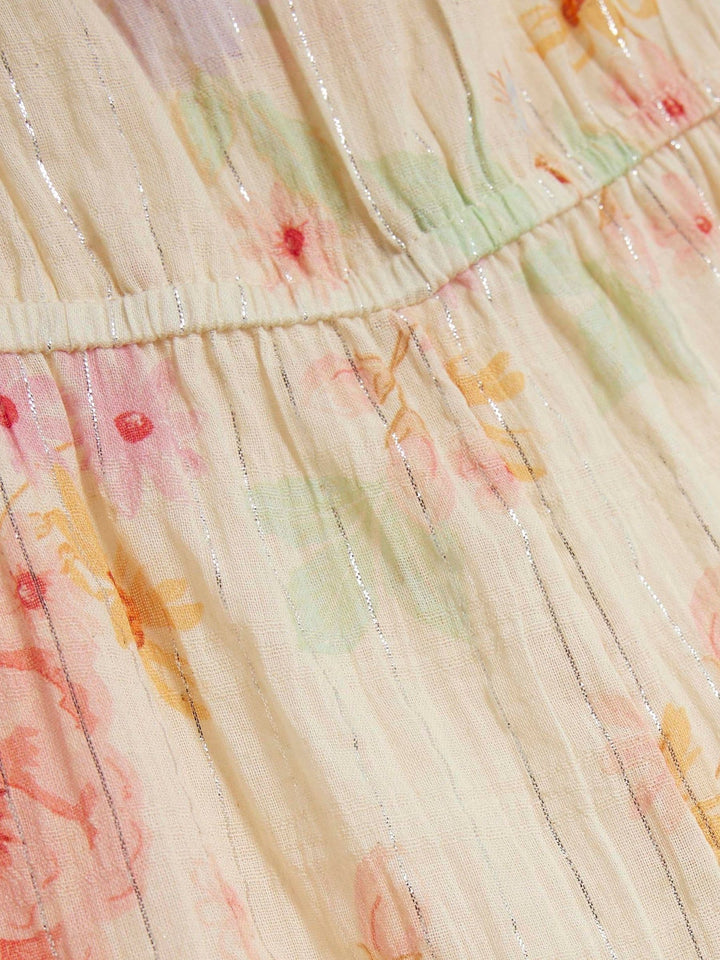 Floral print Square neckline Tied detail Back buttoned fastening Sleeveless Machine washable. 97% Cotton, 3% Metallised fibre. Country of Origin: Great Britain