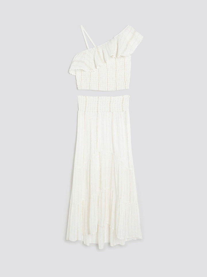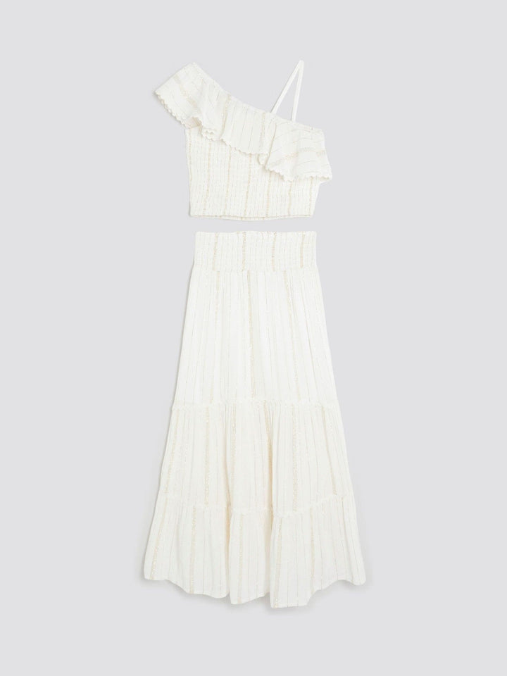 Set of 2 Matching glitter stripe Top: Asymmetric neckline Shirred Strapped Sleeveless Trousers: Elasticated waist 100% Polyester. Country of Origin: Great Britain