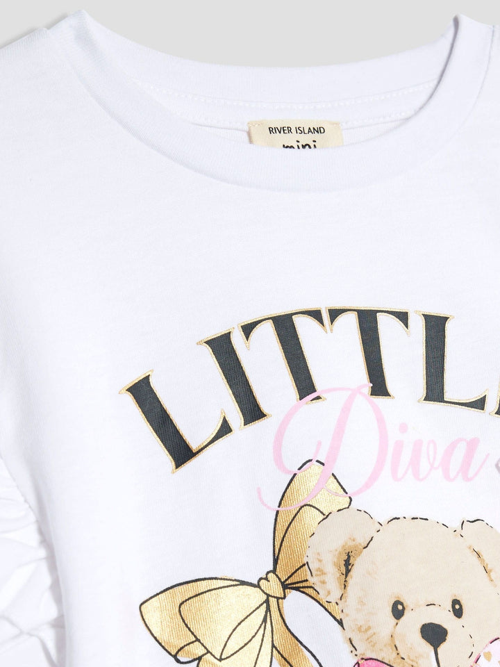 River Island White Girls Frill Sleeve Bear Print T-Shirt