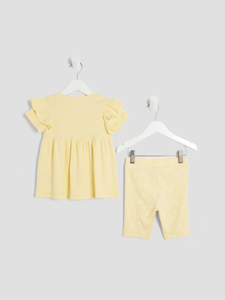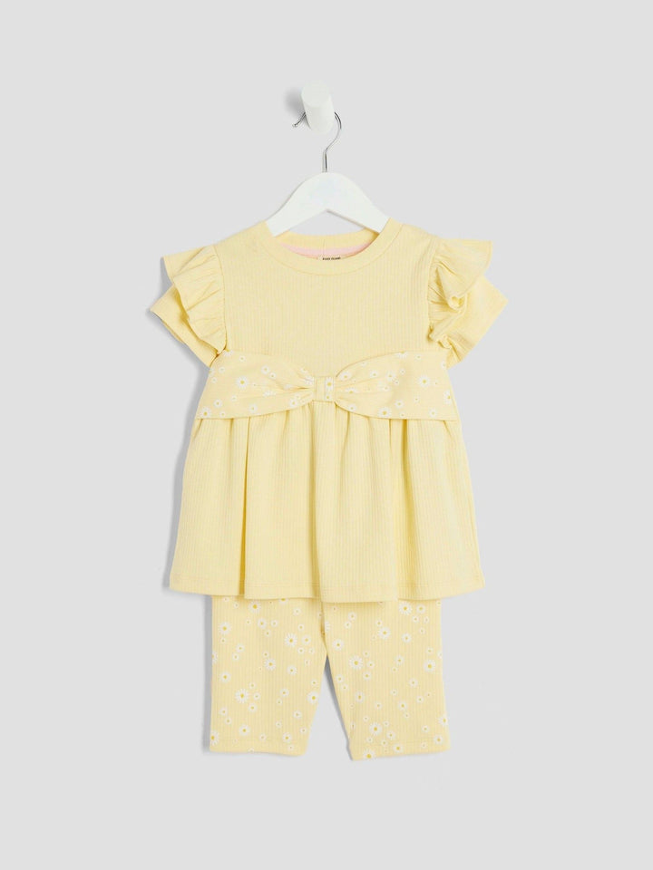 Set of 2 Matching daisy print Top: Crew neck Bow style Frilled short sleeves Lightweight Shorts: Elasticated waist Washable. 95% Cotton, 5% Elastane. Country of Origin: Great Britain