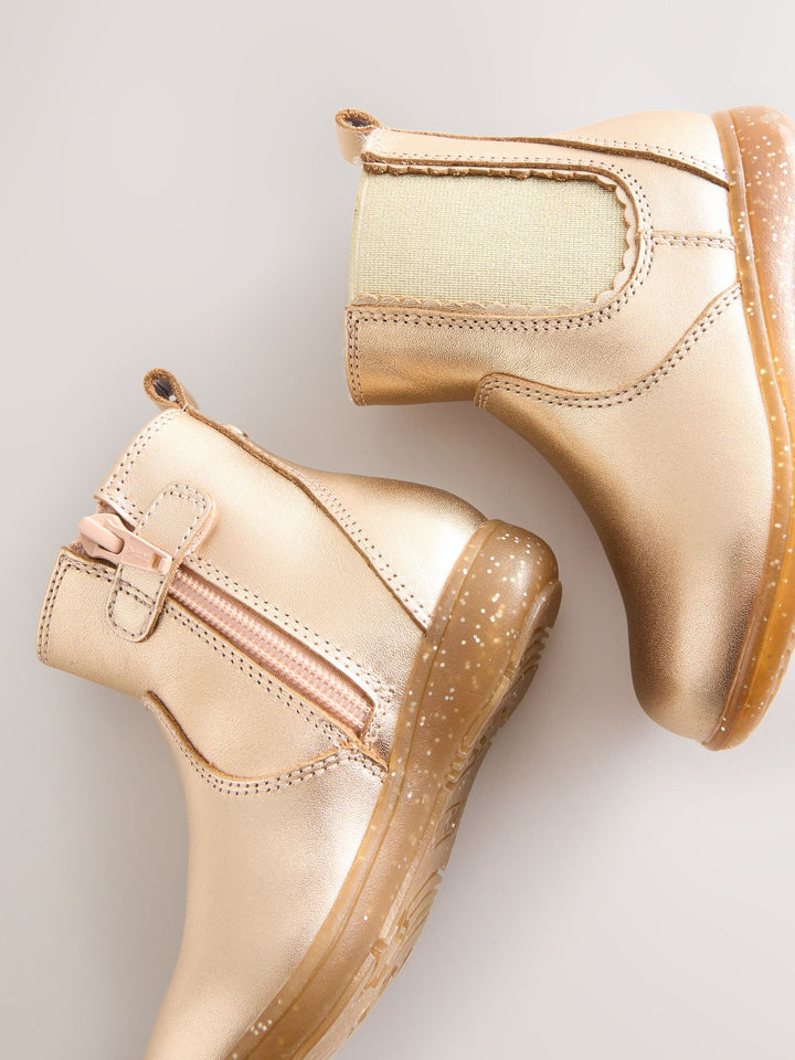 Perfect for any occasion, these standard fit rose gold leather Chelsea ankle boots are a fun and stylish choice. The shiny, metallic leather finish and the classic Chelsea boot style add a sophisticated touch to any outfit. The boots feature a slip-on style with elasticated sides and a slip-resistant durable sole for a comfortable and practical finish for all-day wear. Leather material Slip-on style Slip-resistant durable sole Chelsea ankle boots Standard fit Inside zip for easy fitting Upper - Leather, Textile, Lining & Sock - Other Materials, Textile, Sole - Other Materials. Country of Origin: China