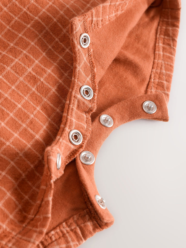 Nestle your newborn in our rust brown woven dungaree and bodysuit set. This dreamy duo is made up of a soft woven check dungaree with adjustable length straps and a soft jersey bodysuit. 2 piece set 100% cotton Woven dungaree Short sleeve bodysuit Popper fastening Machine washable. Dungaree Main 90% Cotton, 10% Linen. Lining 100% Cotton. Bodysuit 100% Cotton. Country of Origin: Sri Lanka Warning: Keep away from fire and flames.