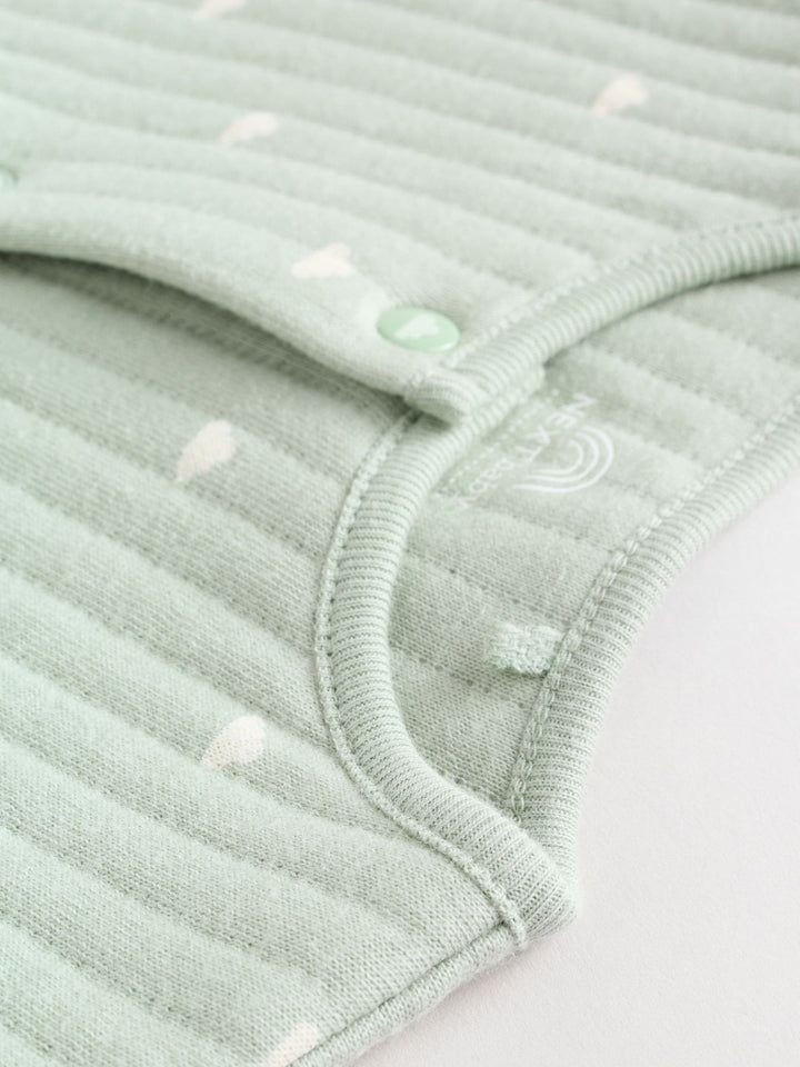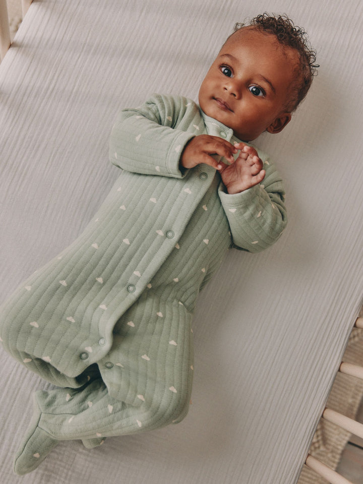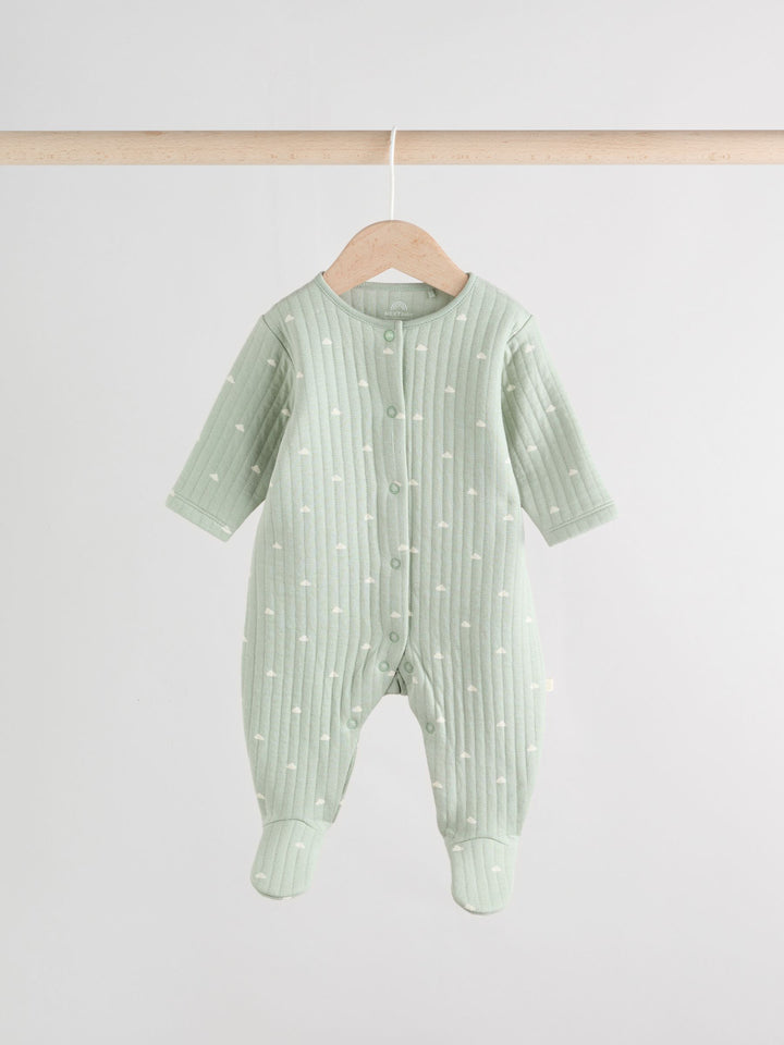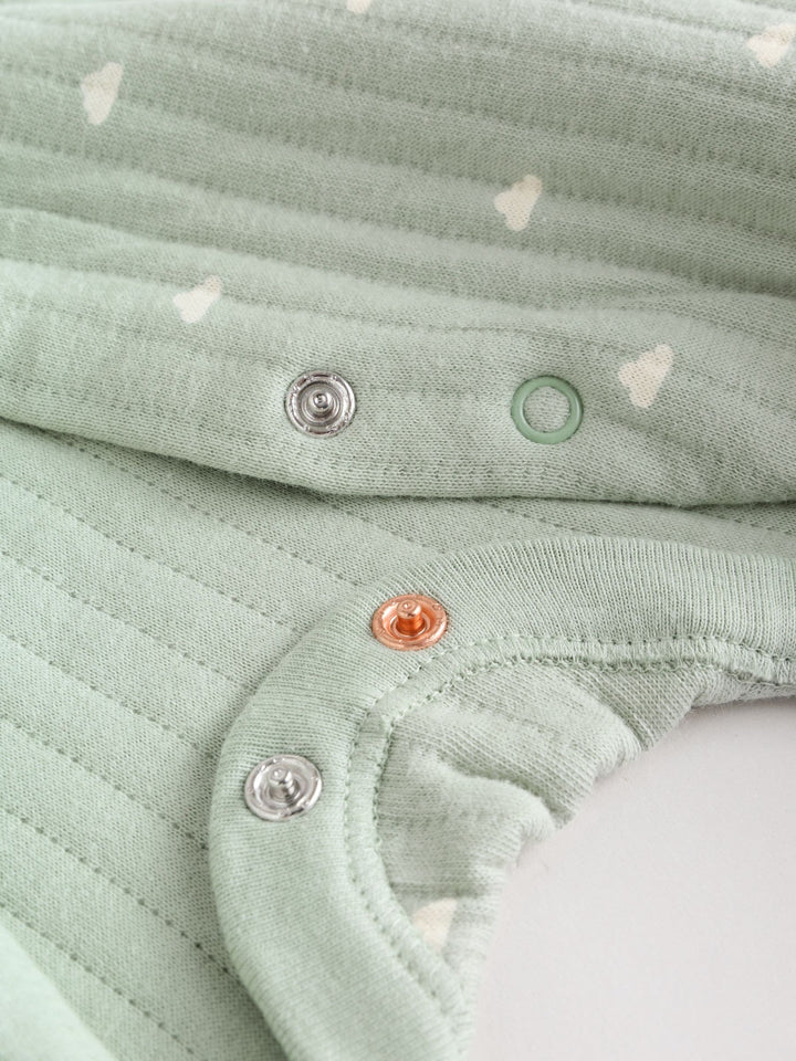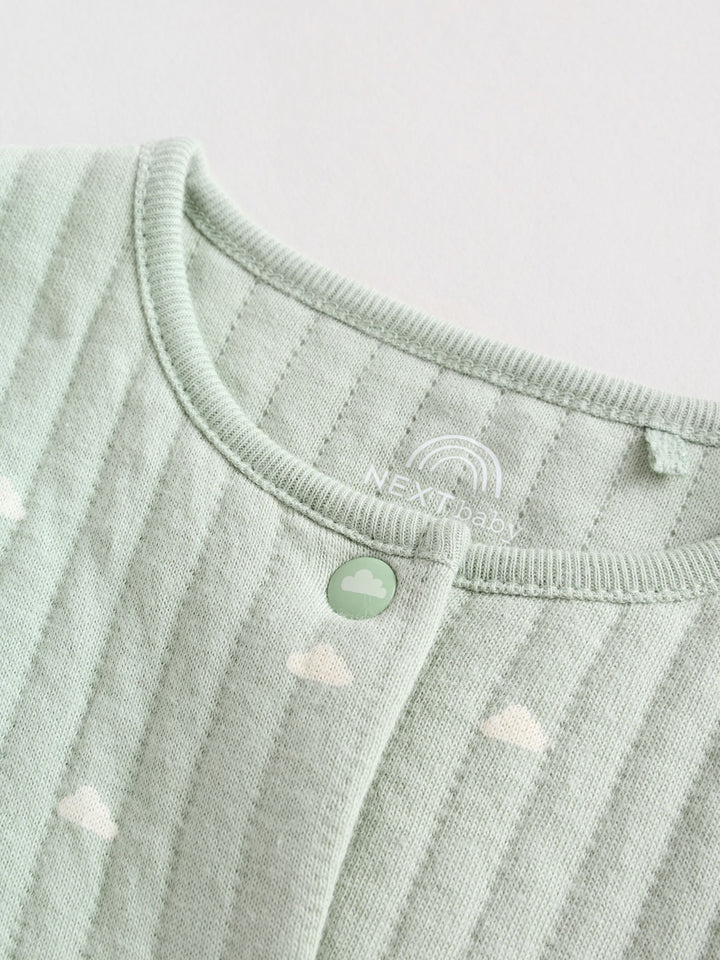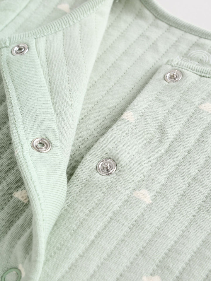 Keep them snug and comfortable in this 2 pack of sage green baby sleepsuits. The quilted design and soft cotton fabric provide a cosy feel, while the full popper fastening makes dressing and nappy changes a breeze. With a playful mix of patterns and a plain design, this pack is a practical and adorable addition to their bedtime essentials Quilted design Super soft cotton Popper front fastening Inner lined feet Anti-slip sole print from 9-12 months No harmful chemicals or dyes Nickel-free poppers 2 pack Machine washable. 2 x Sleepsuit 75% Cotton, 25% Recycled polyester. Country of Origin: India Warning: Keep away from fire and flames.