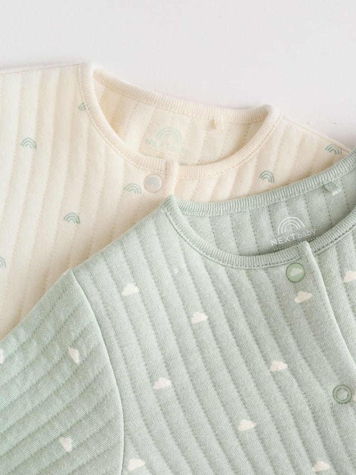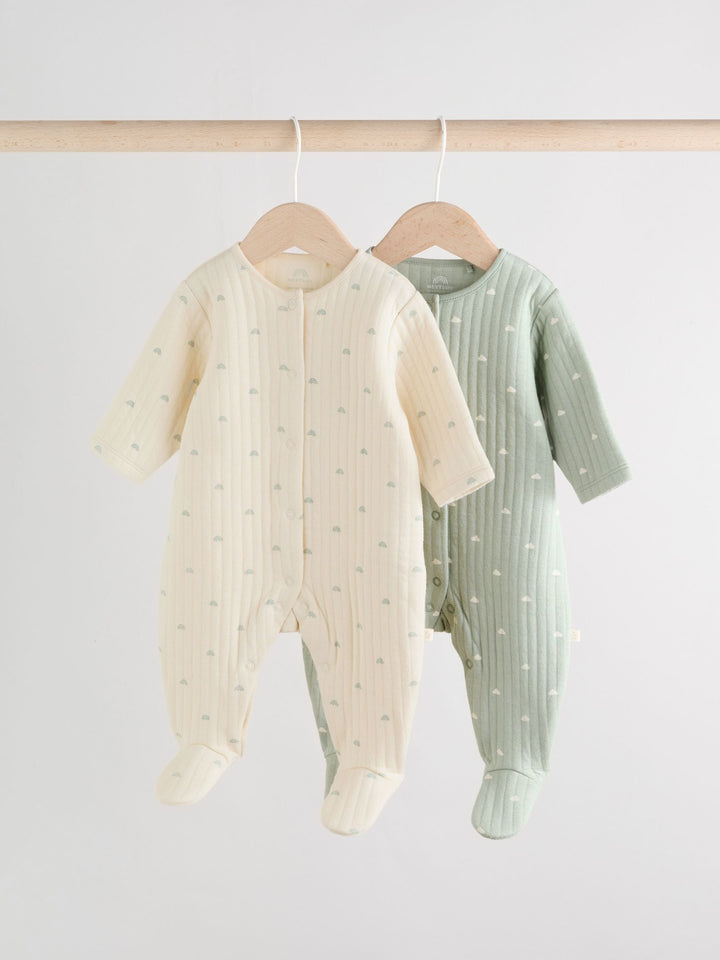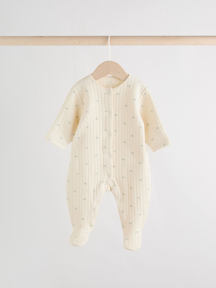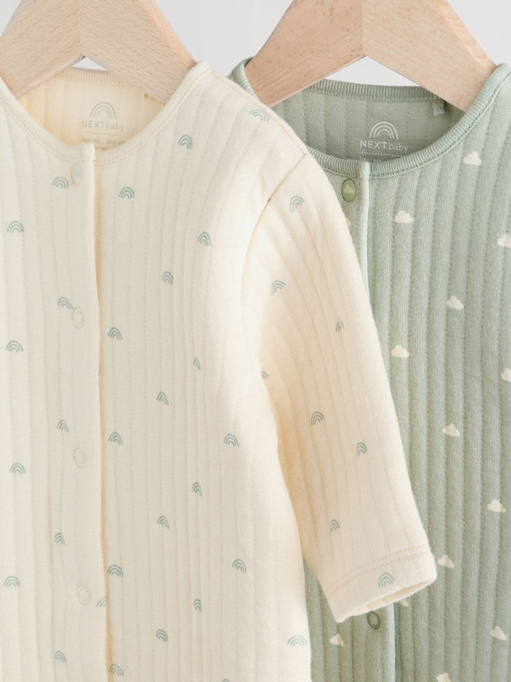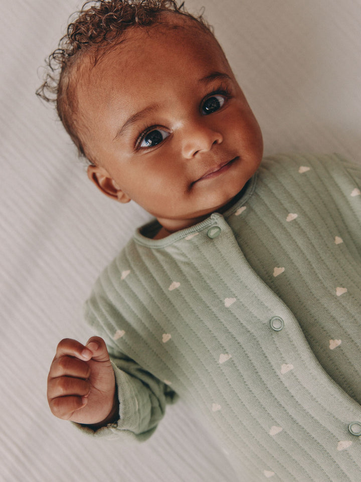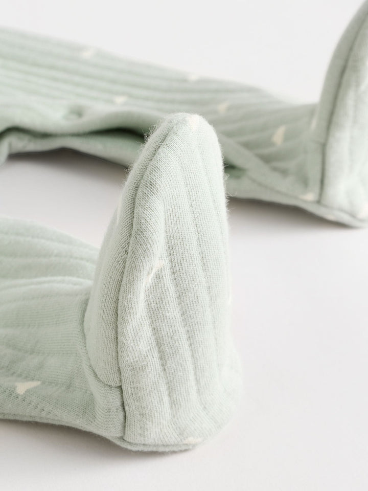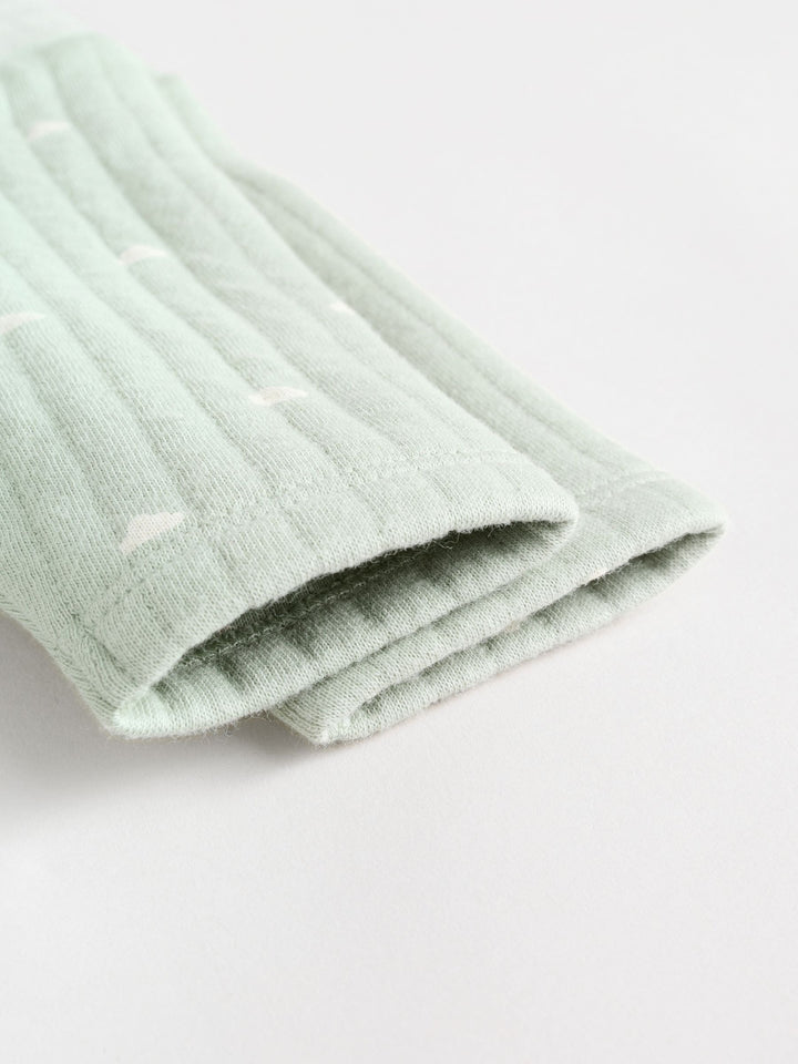 Keep them snug and comfortable in this 2 pack of sage green baby sleepsuits. The quilted design and soft cotton fabric provide a cosy feel, while the full popper fastening makes dressing and nappy changes a breeze. With a playful mix of patterns and a plain design, this pack is a practical and adorable addition to their bedtime essentials Quilted design Super soft cotton Popper front fastening Inner lined feet Anti-slip sole print from 9-12 months No harmful chemicals or dyes Nickel-free poppers 2 pack Machine washable. 2 x Sleepsuit 75% Cotton, 25% Recycled polyester. Country of Origin: India Warning: Keep away from fire and flames.
