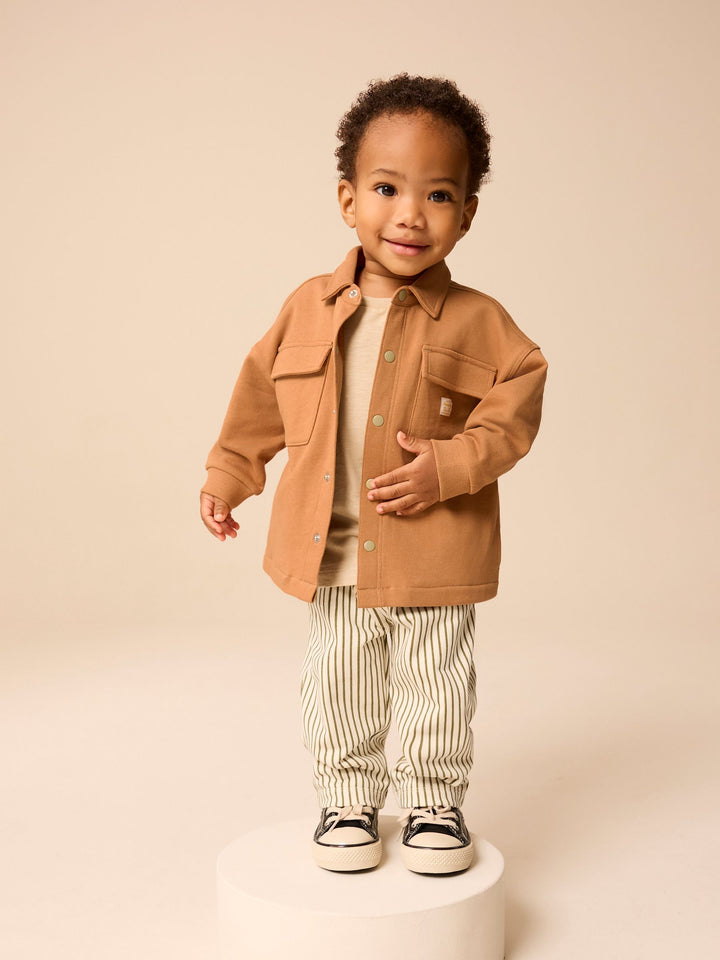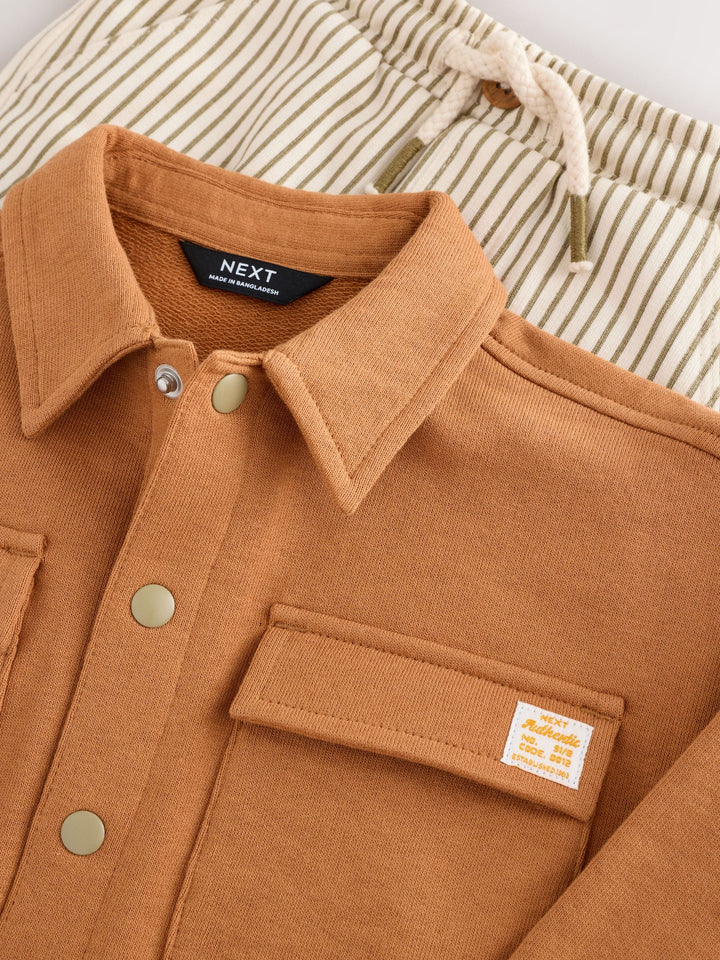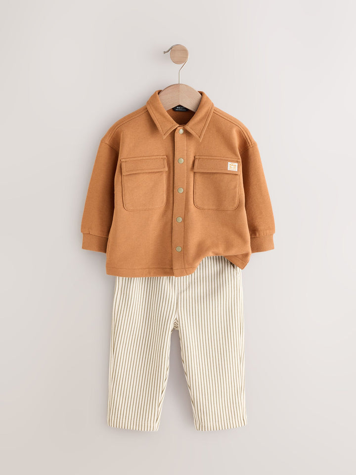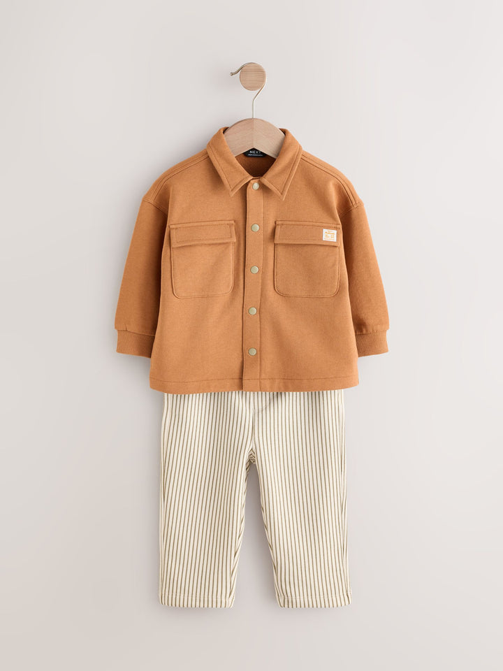 They'll look all grown up in this smart-casual 2-piece outfit, featuring a tan brown pure cotton jersey overshirt with a pointed collar, flap chest pockets and a popper fastening, alongside a pair of striped jogging bottoms with an elasticated waistband. 2-piece set 100% cotton overshirt Popper fastening Pointed collar Flap pockets Cosy jogging bottoms Elasticated waistband Machine washable. Sweater 100% Cotton. Jogger 80% Cotton, 20% Recycled polyester. Country of Origin: Bangladesh