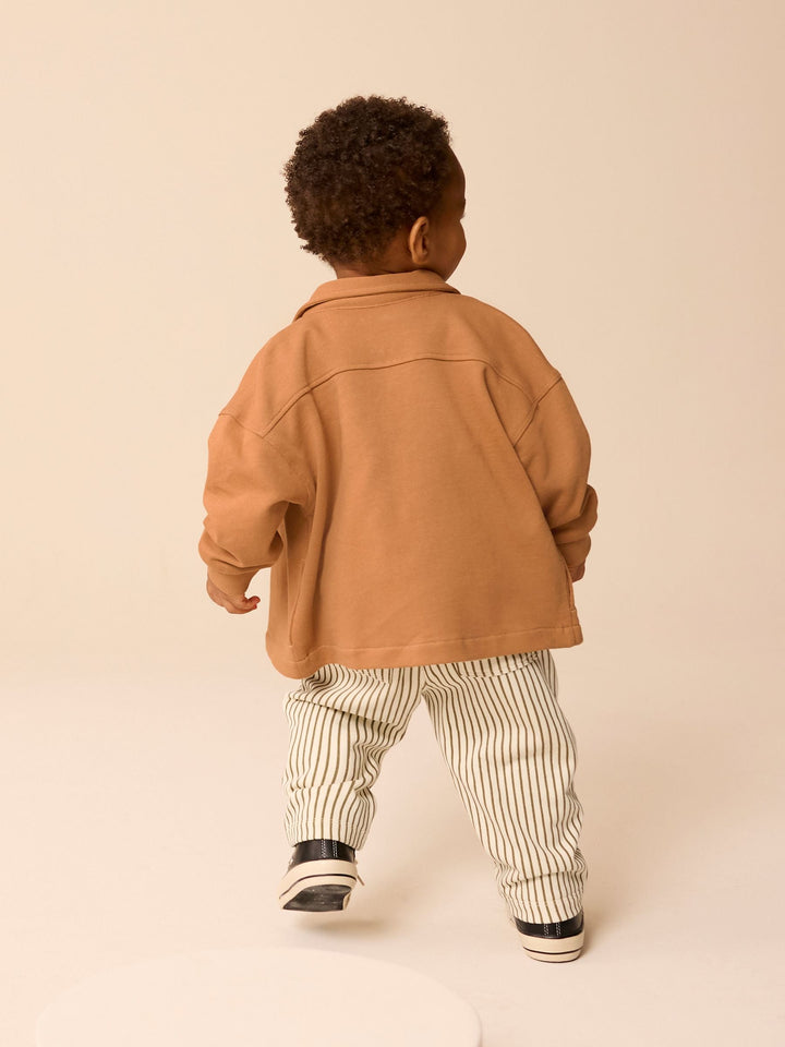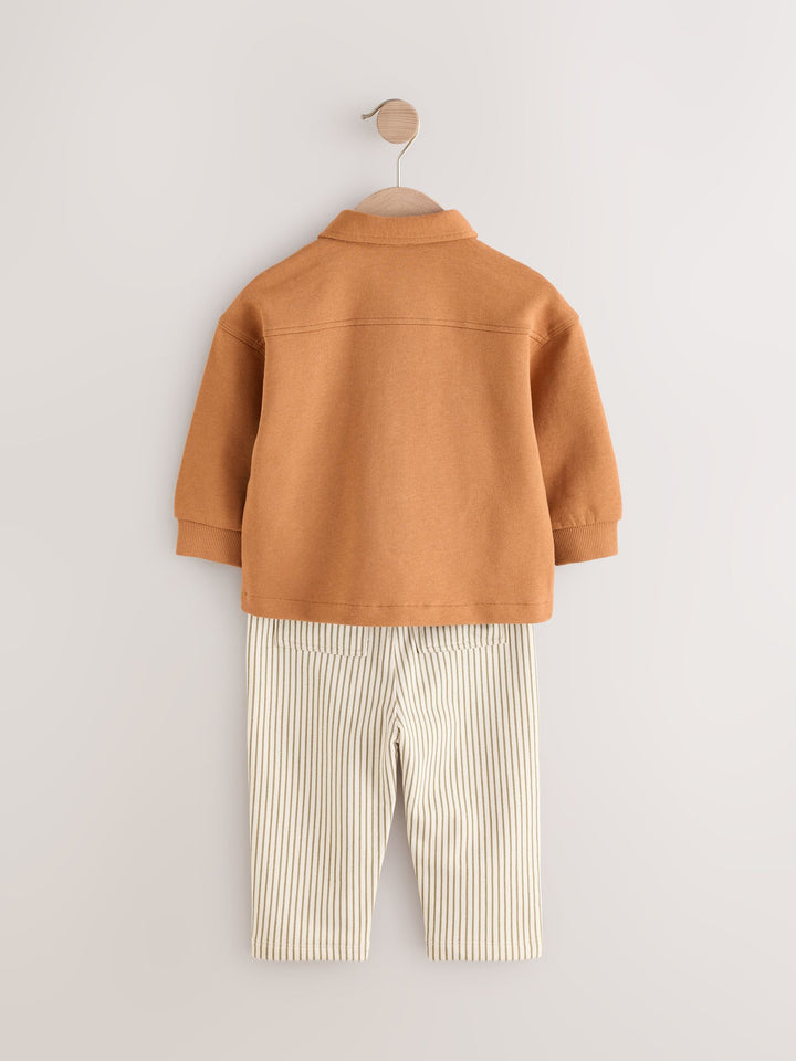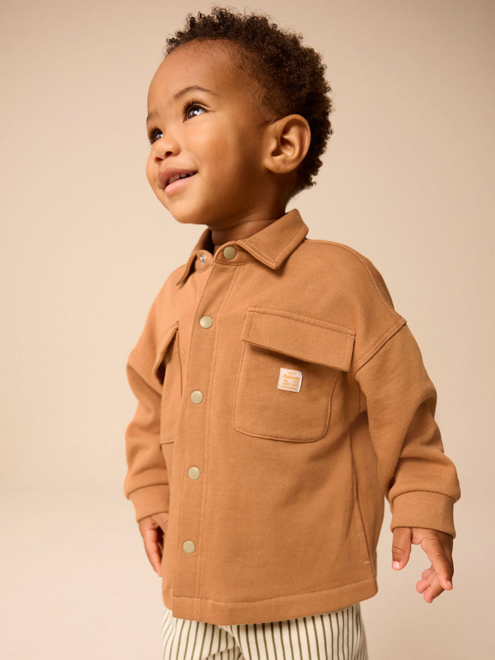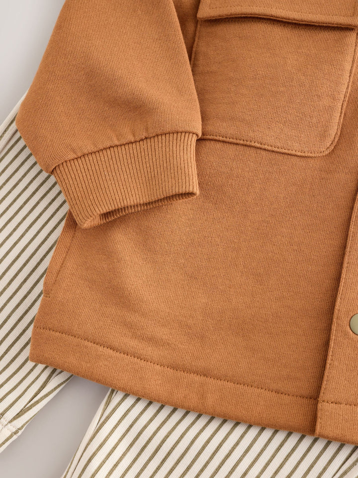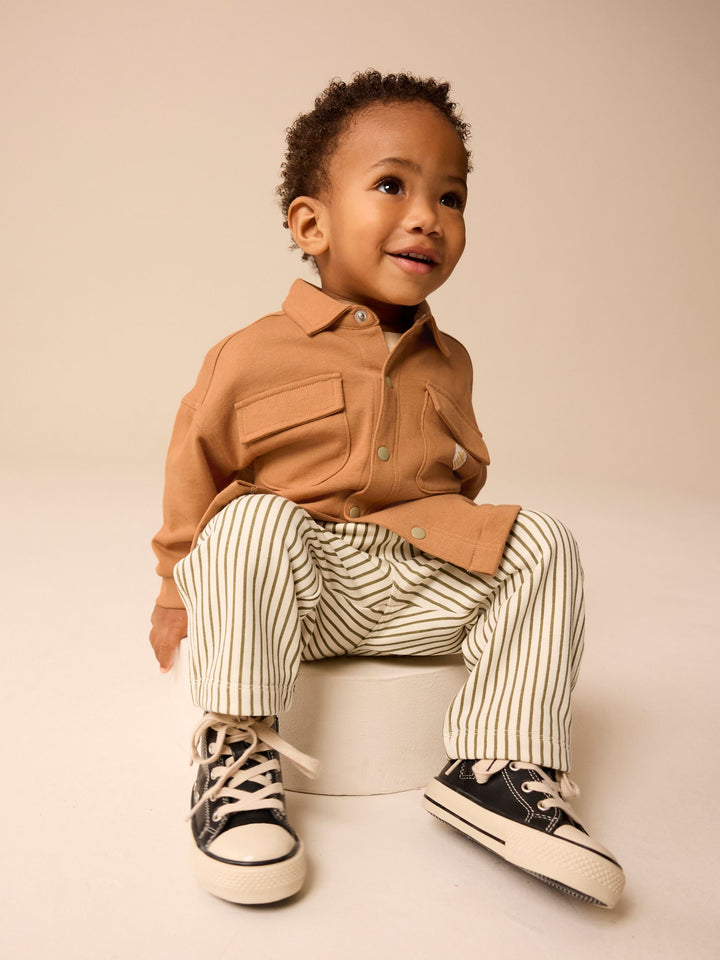 They'll look all grown up in this smart-casual 2-piece outfit, featuring a tan brown pure cotton jersey overshirt with a pointed collar, flap chest pockets and a popper fastening, alongside a pair of striped jogging bottoms with an elasticated waistband. 2-piece set 100% cotton overshirt Popper fastening Pointed collar Flap pockets Cosy jogging bottoms Elasticated waistband Machine washable. Sweater 100% Cotton. Jogger 80% Cotton, 20% Recycled polyester. Country of Origin: Bangladesh