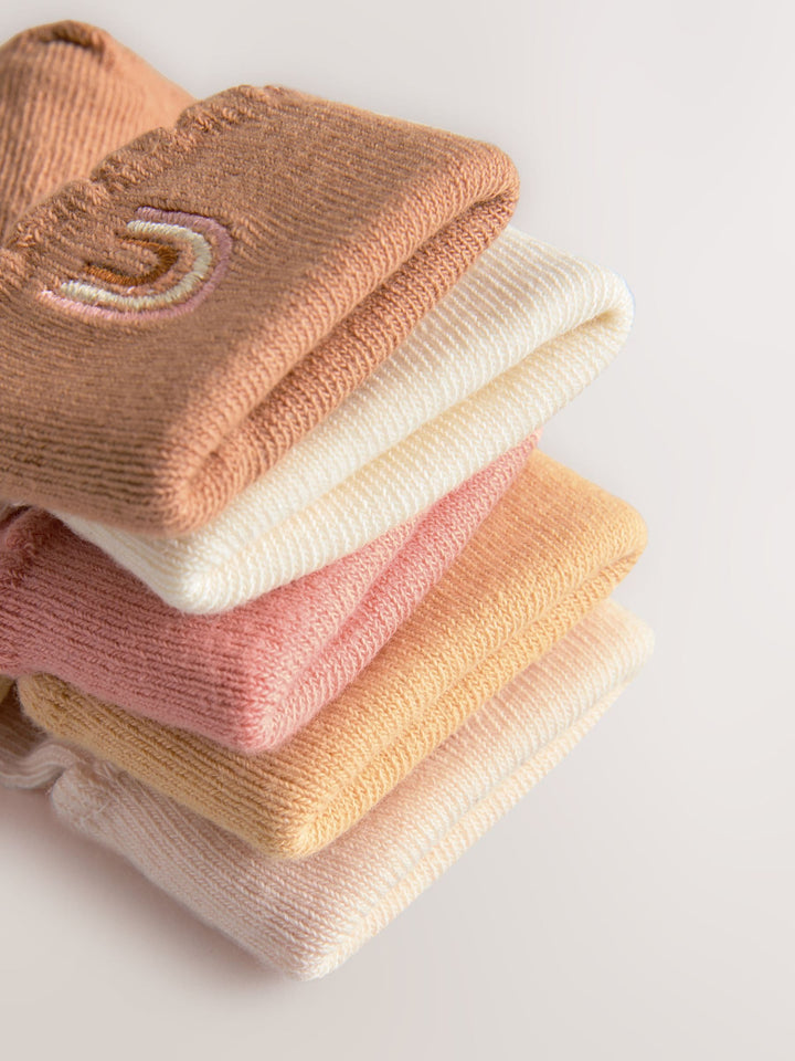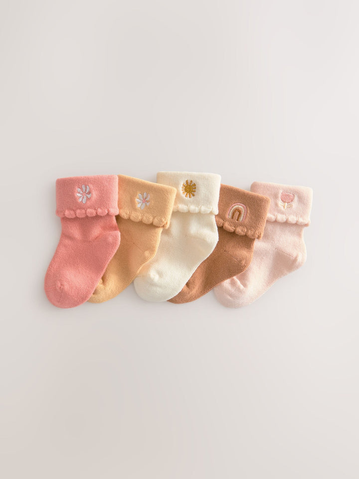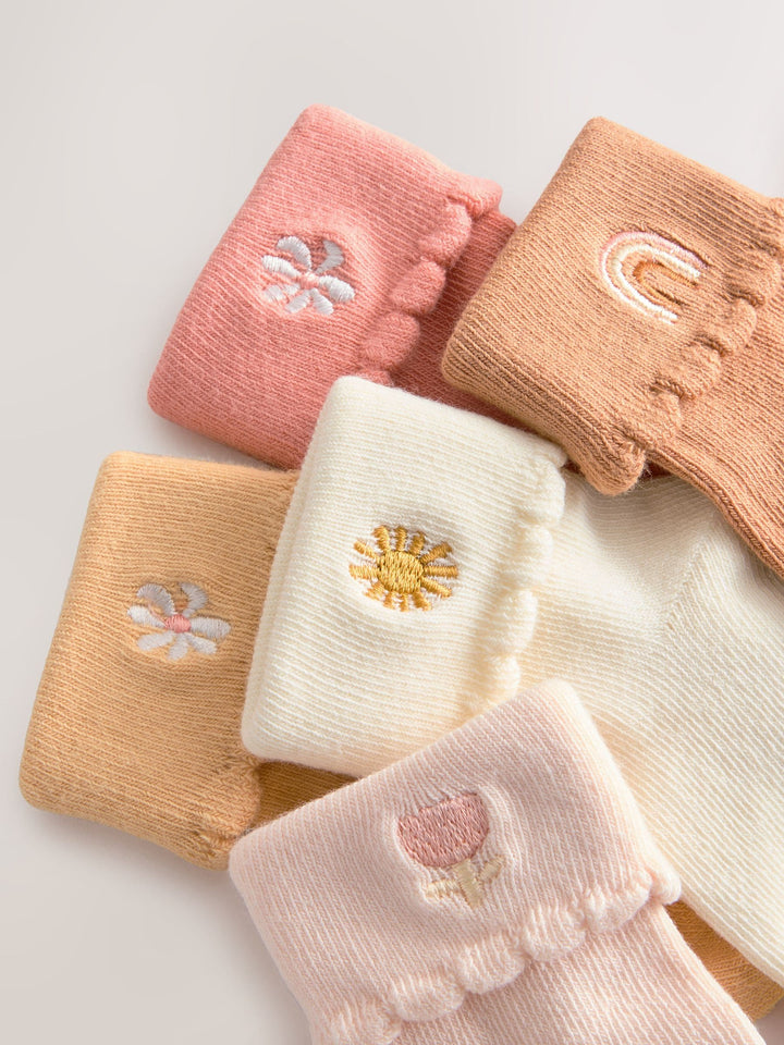 Tan Brown Embroidered Baby Roll Top Socks 5 Pack (0mths-2yrs)