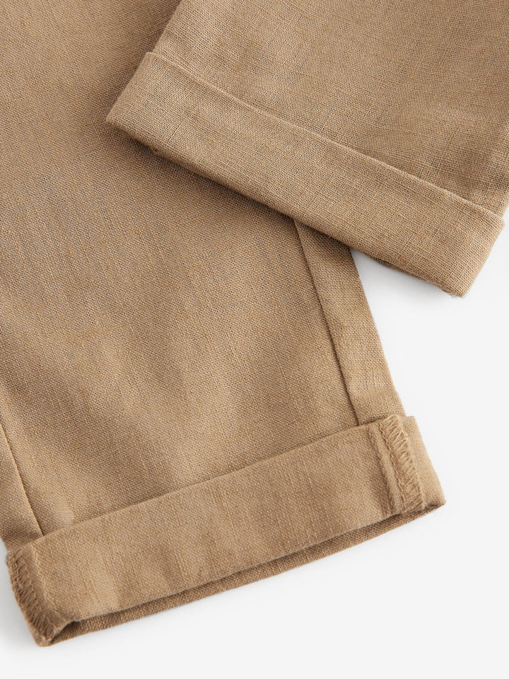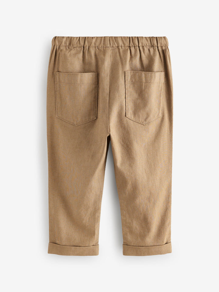 Easy to wear, stylish and made from a summer-friendly cotton and linen blend, these tan brown trousers have a loose fit, an adjustable elasticated waistband, side pockets and a turn-up ankle hem. Loose fit Cotton and linen blend Elasticated waistband Adjustable drawstring Side pockets 55% Linen, 45% Cotton. Country of Origin: Bangladesh