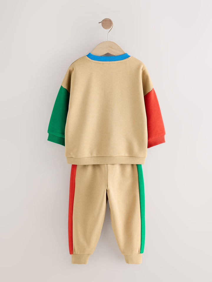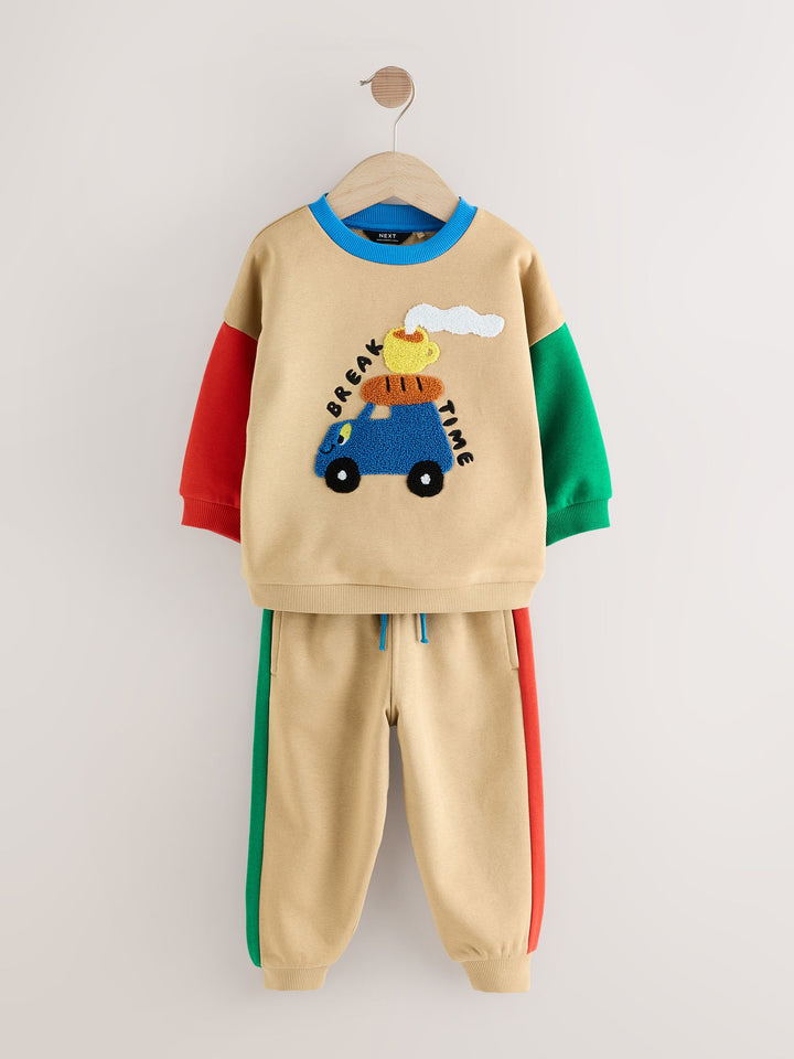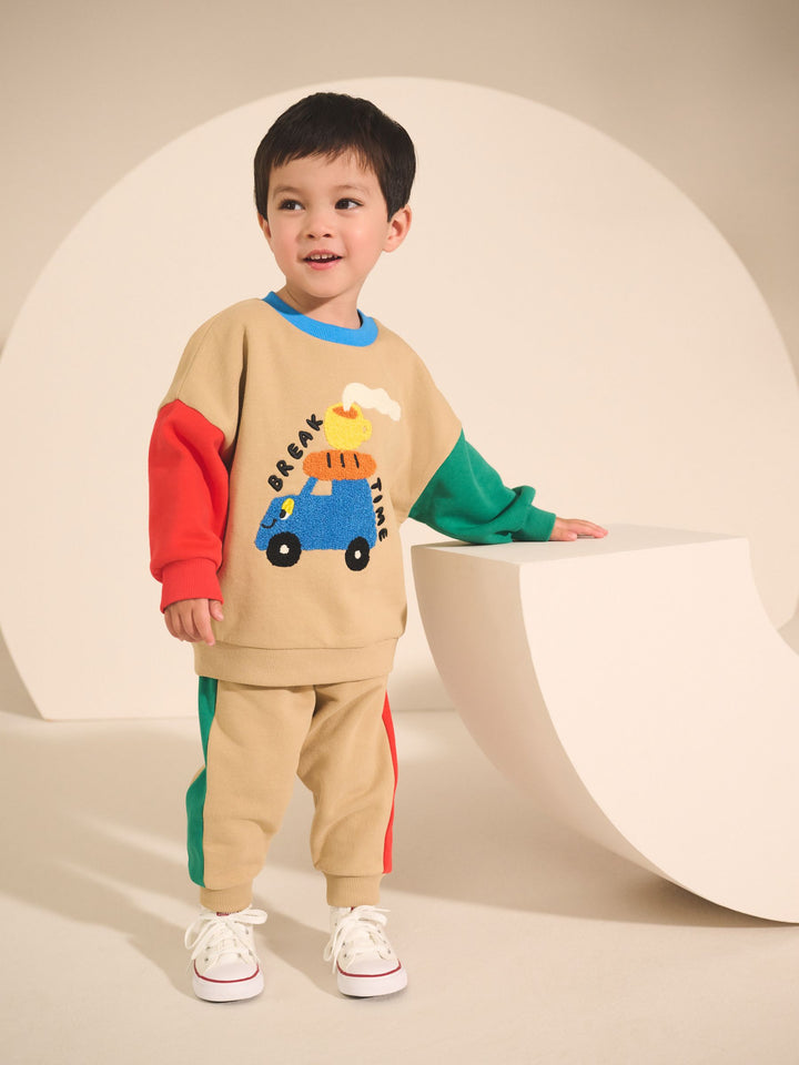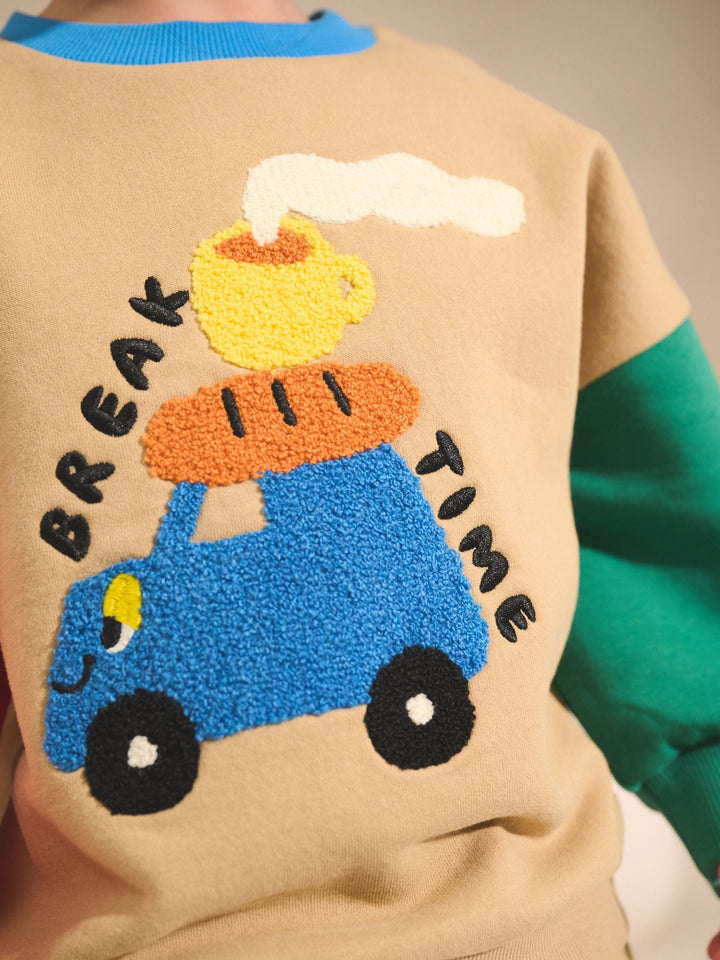 Get ready for an adventure with this fun Sweatshirt and Joggers Set. This vibrant two-piece outfit is defined by its playful colourblock design, featuring a tan sweatshirt body with contrasting bright red and green sleeves and a blue crew neck trim. The front of the sweatshirt is decorated with a tactile boucle chest graphic of a car loaded with travel snacks, featuring the playful text 'BREAK TIME.' The matching joggers continue the theme with coordinating red and green side stripes, completing this comfortable and eye-catching set perfect for playtime. 2 piece set Boucle detail Colourblock design Machine washable. Sweater and Jogger 80% Cotton, 20% Recycled polyester. Country of Origin: Bangladesh