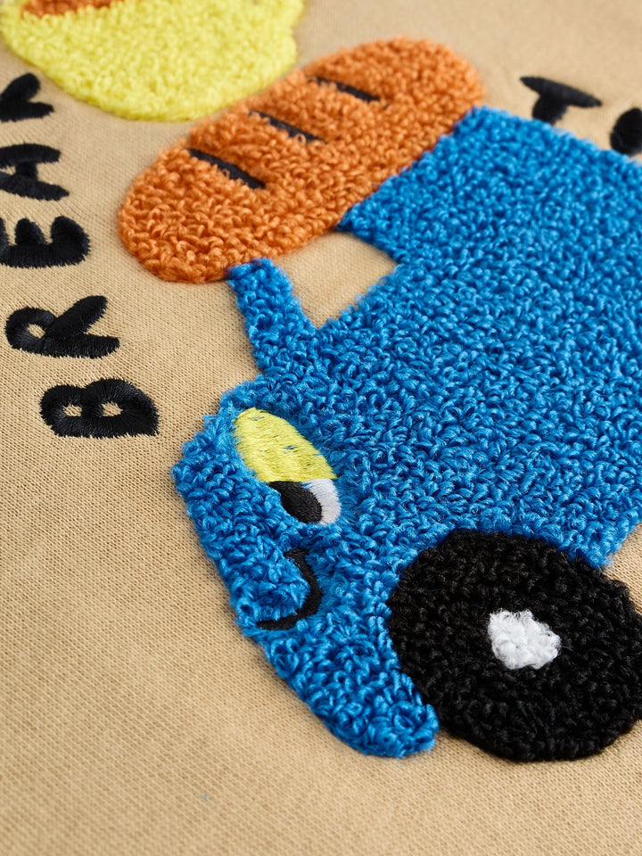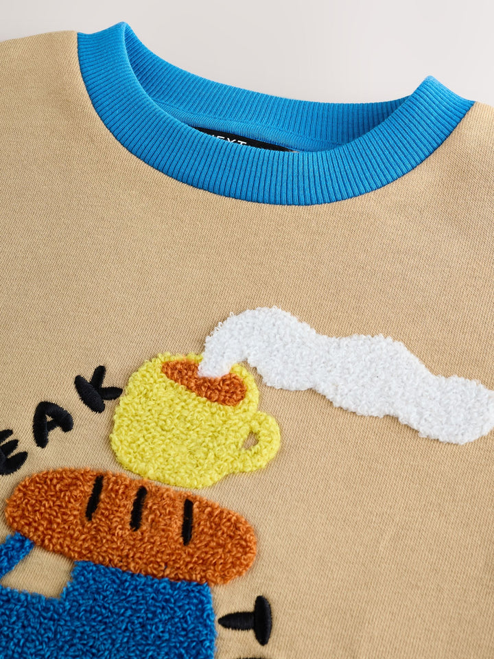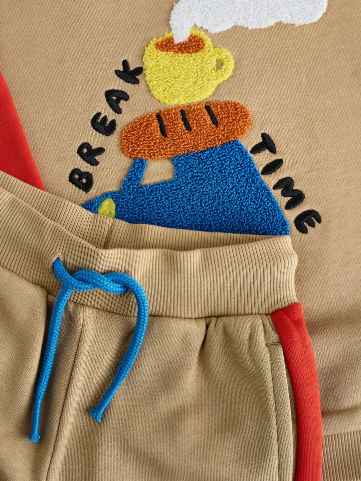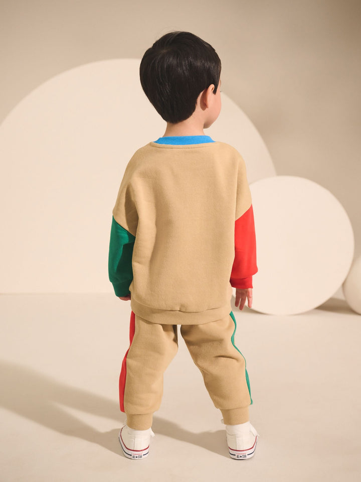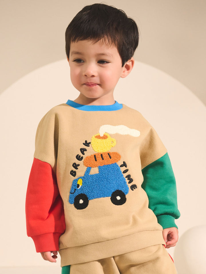 Get ready for an adventure with this fun Sweatshirt and Joggers Set. This vibrant two-piece outfit is defined by its playful colourblock design, featuring a tan sweatshirt body with contrasting bright red and green sleeves and a blue crew neck trim. The front of the sweatshirt is decorated with a tactile boucle chest graphic of a car loaded with travel snacks, featuring the playful text 'BREAK TIME.' The matching joggers continue the theme with coordinating red and green side stripes, completing this comfortable and eye-catching set perfect for playtime. 2 piece set Boucle detail Colourblock design Machine washable. Sweater and Jogger 80% Cotton, 20% Recycled polyester. Country of Origin: Bangladesh