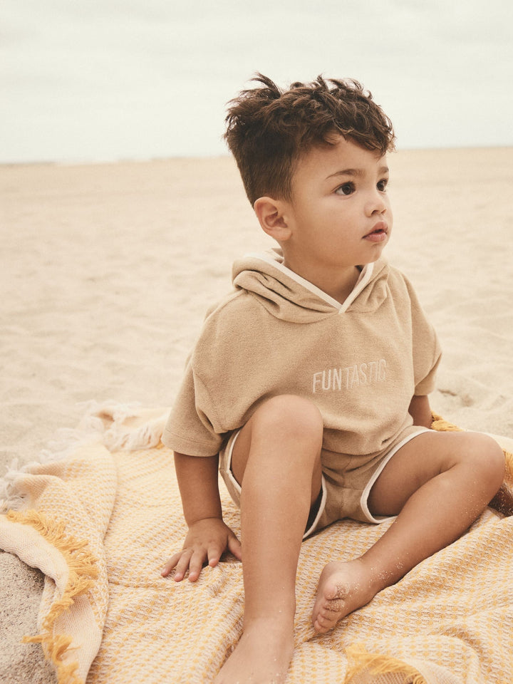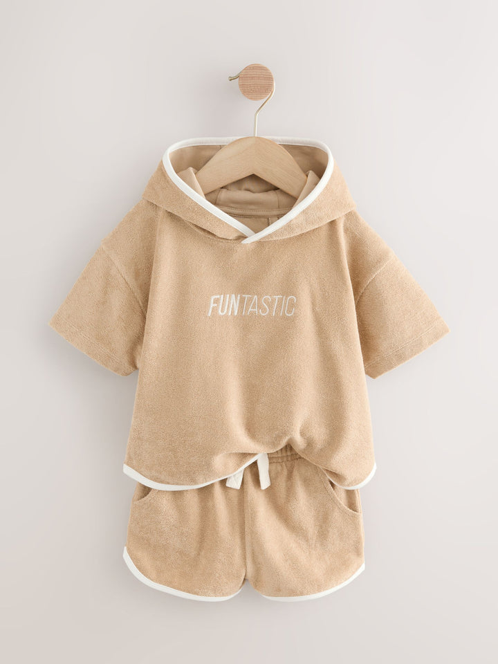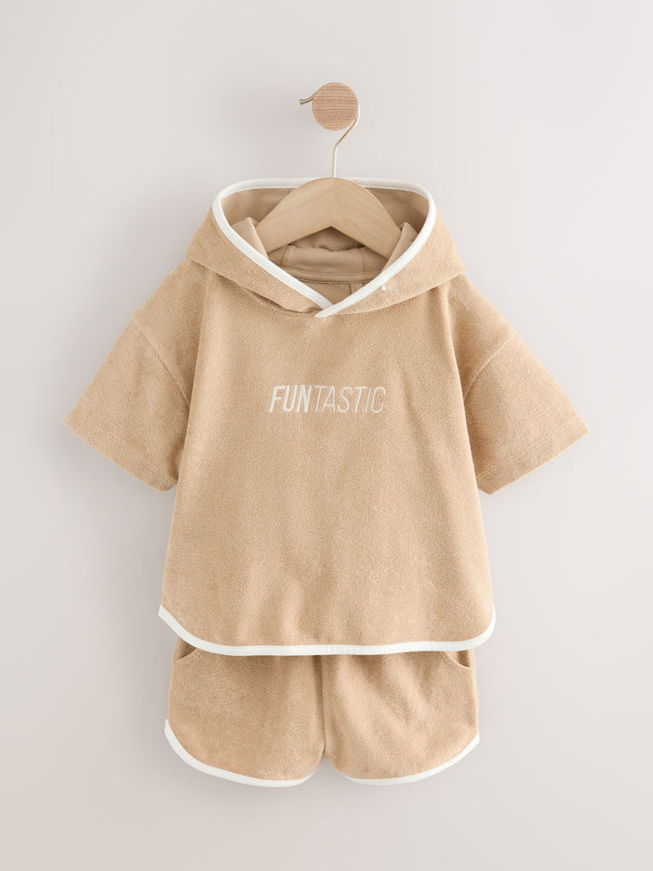 Ideal for the beach, the pool or a laid-back look, this 2-piece set is made from a super absorbent cotton fabric with a toweling texture, featuring a short sleeve hooded top and coordinating shorts with an adjustable elasticated waistband and side pockets. 2-piece set 100% cotton Absorbent toweling texture Hooded short sleeve top Elasticated waistband shorts Drawstring fastening Side pockets Machine washable. Hoodie and Shorts 100% Cotton. Country of Origin: Bangladesh