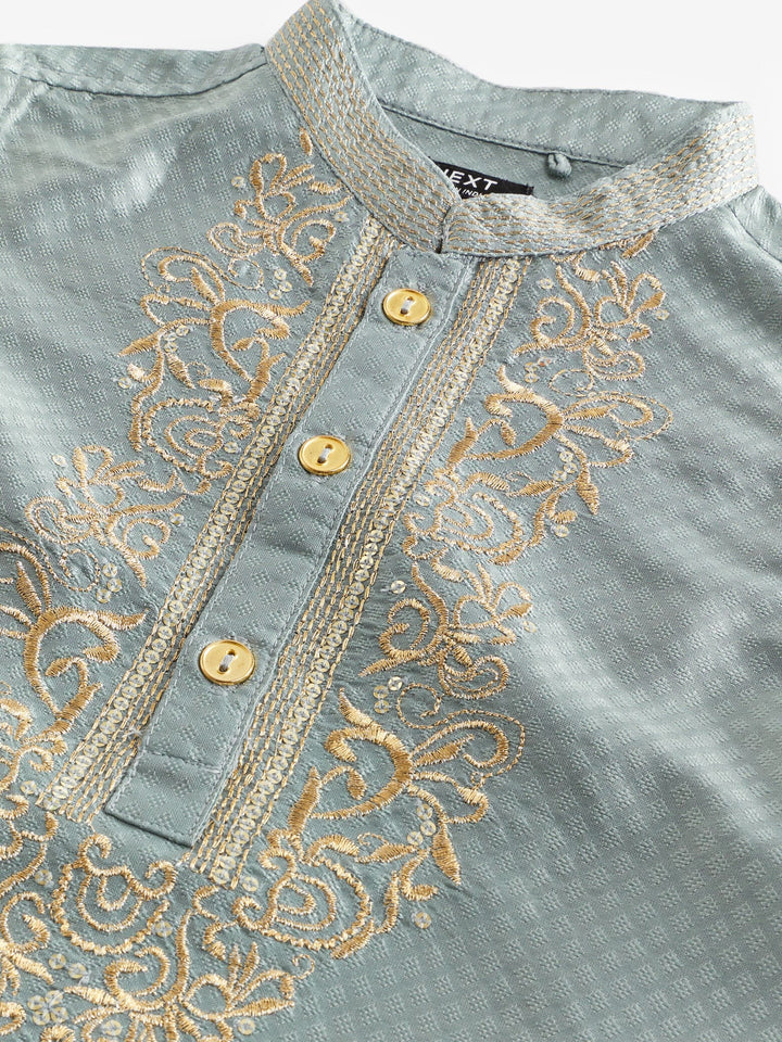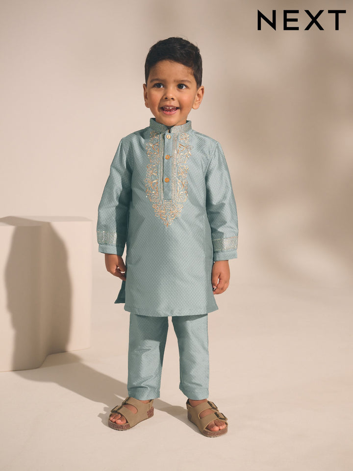 Whatever the special occasion, elevate his dressed-up looks with our boys Turqouise Blue embroidered kurta. This classic kurta silhouette is adorned with intricate embroidery around the neck and collar area. Ideal for Eid, weddings or other festive events. Kurta shape Embroidered detail Long sleeves 100% Polyester. Country of Origin: India