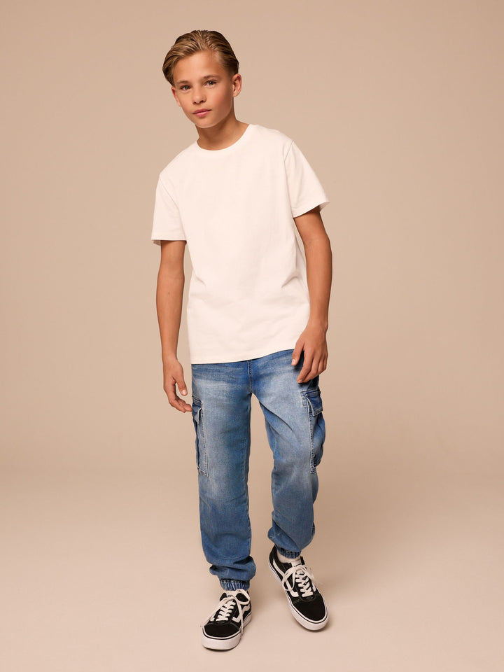 Cargo jeans Elasticated waist with a drawcord Cuffed ankle Multiple pockets Adjustable waist Machine washable. 56% Cotton, 28% Viscose, 15% Recycled polyester, 1% Elastane. Country of Origin: Myanmar