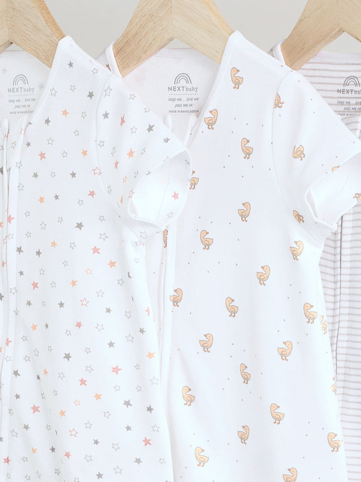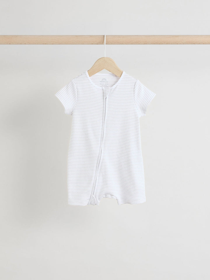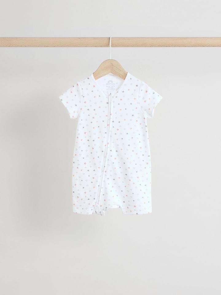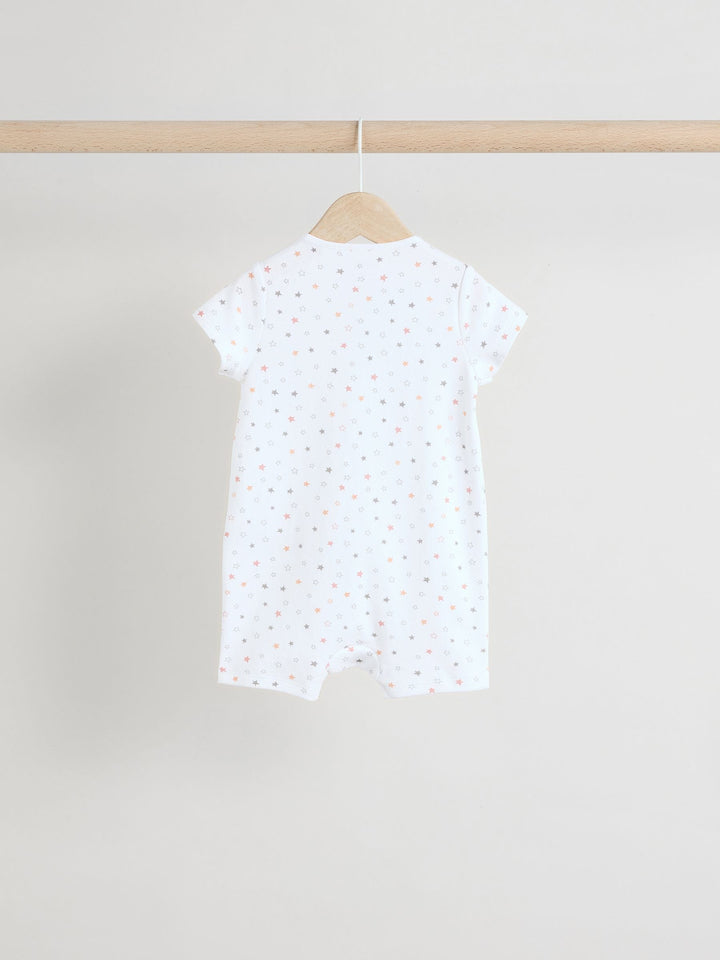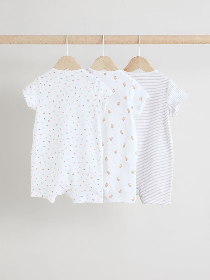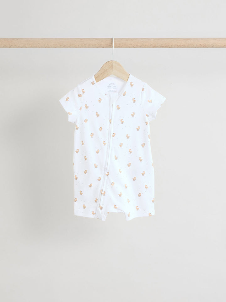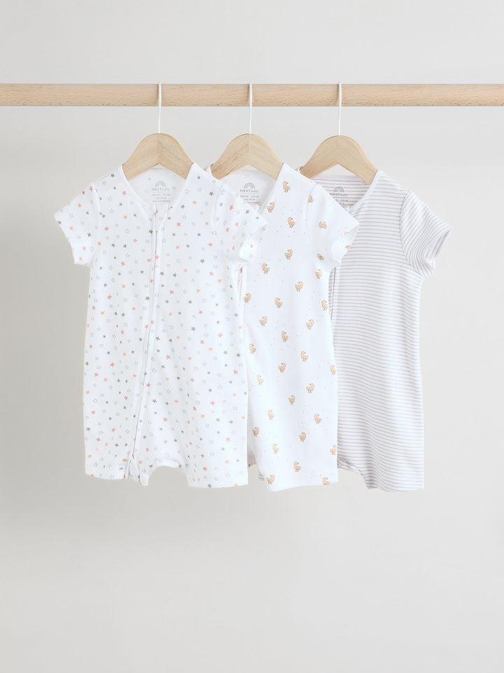 Kit out their collection with our 3 pack of white romper sleepsuits. Made from pure cotton, each piece is coated in a fun print and complete with two way zip fastening and short sleeves. 3 pack 100% cotton Romper style Two way zip fastening Short sleeves Machine washable. 3 x Sleepsuit 100% Cotton. Country of Origin: Bangladesh Warning: Keep away from fire and flames.