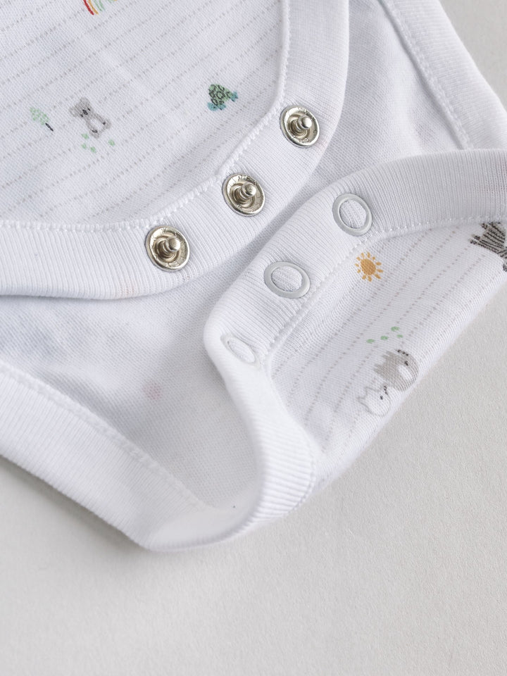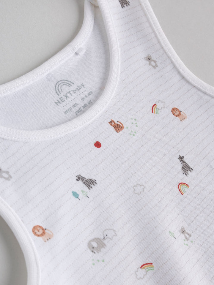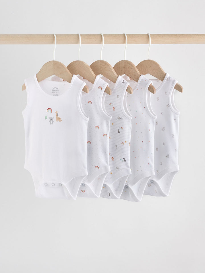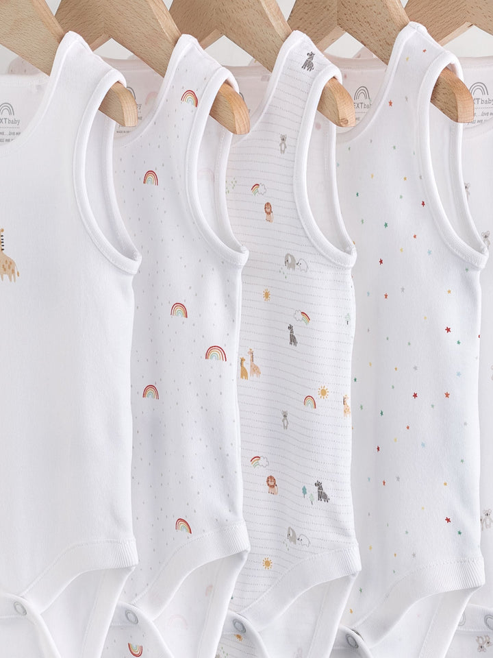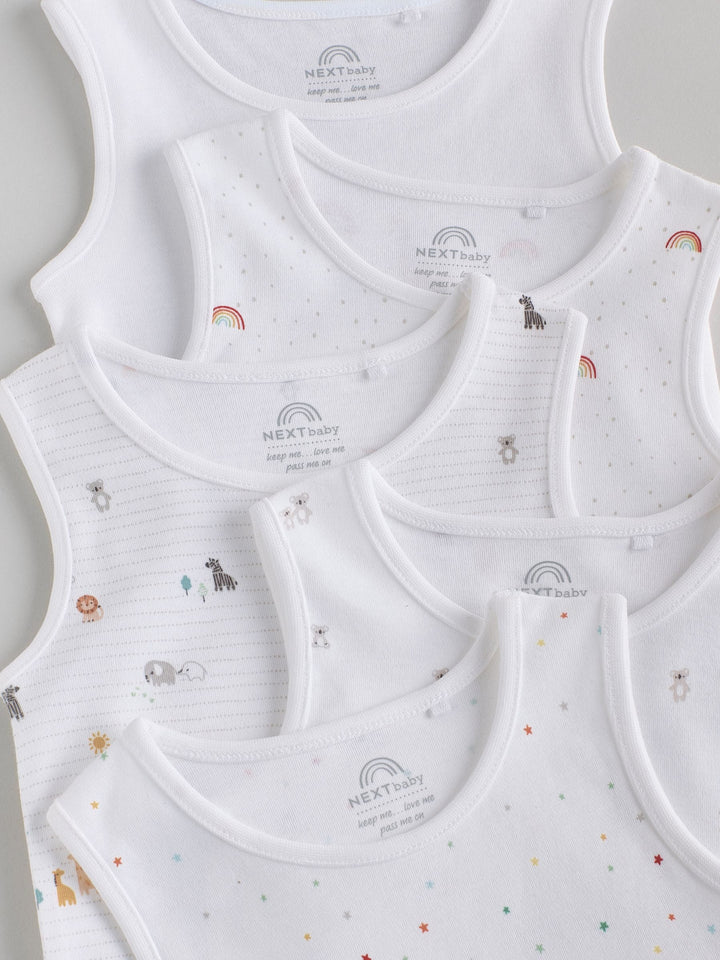 Stock up on a daily essential with this five-pack of white vest bodysuits. Featuring a charming print, the super-soft cotton fabric and nickel-free popper fastenings provide a comfortable and gentle feel, ensuring easy changes and protecting against irritation. 5-pack Super soft cotton Popper bottom fastening Nickel-free poppers Machine washable. 5 x Bodysuit 100% Cotton. Country of Origin: Sri Lanka Warning: Keep away from fire and flames.