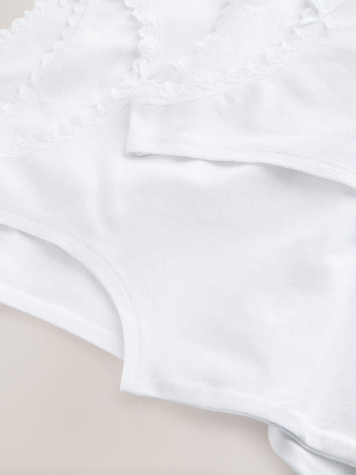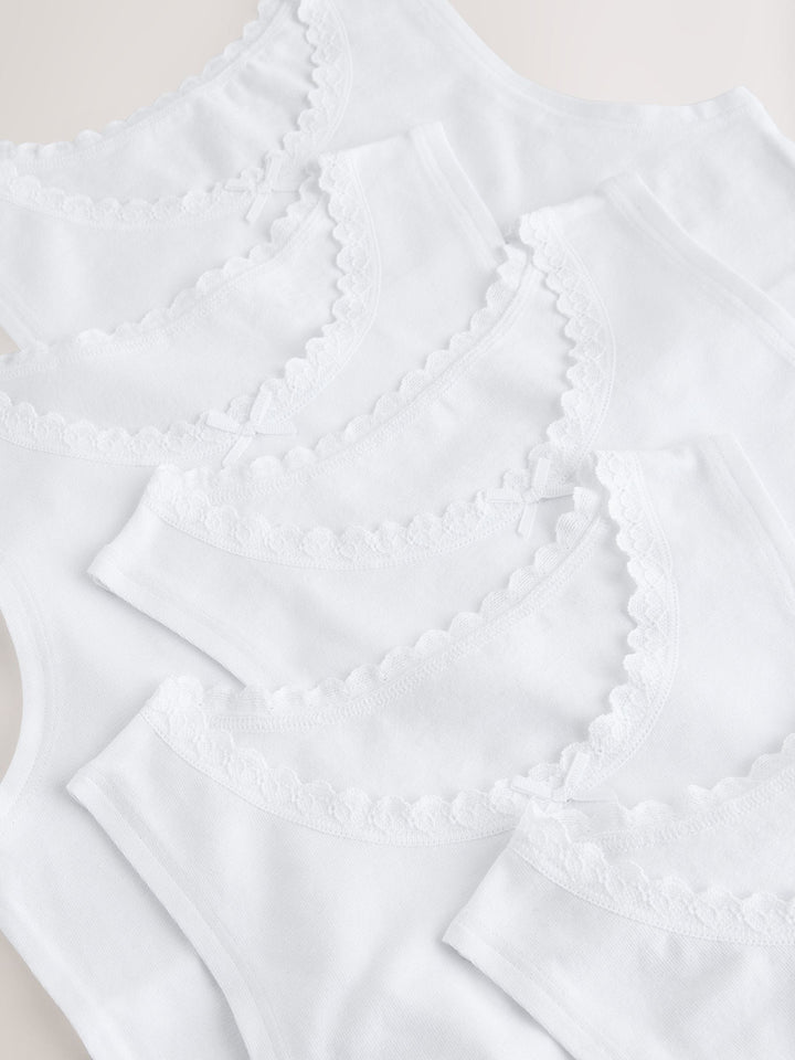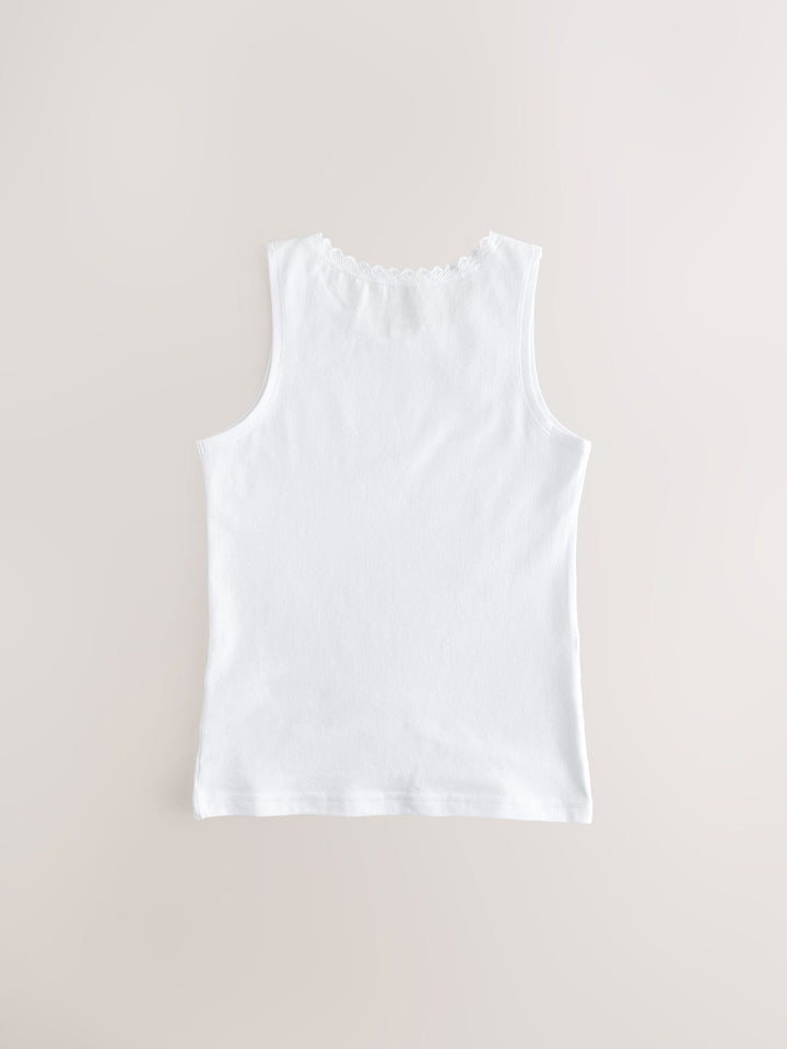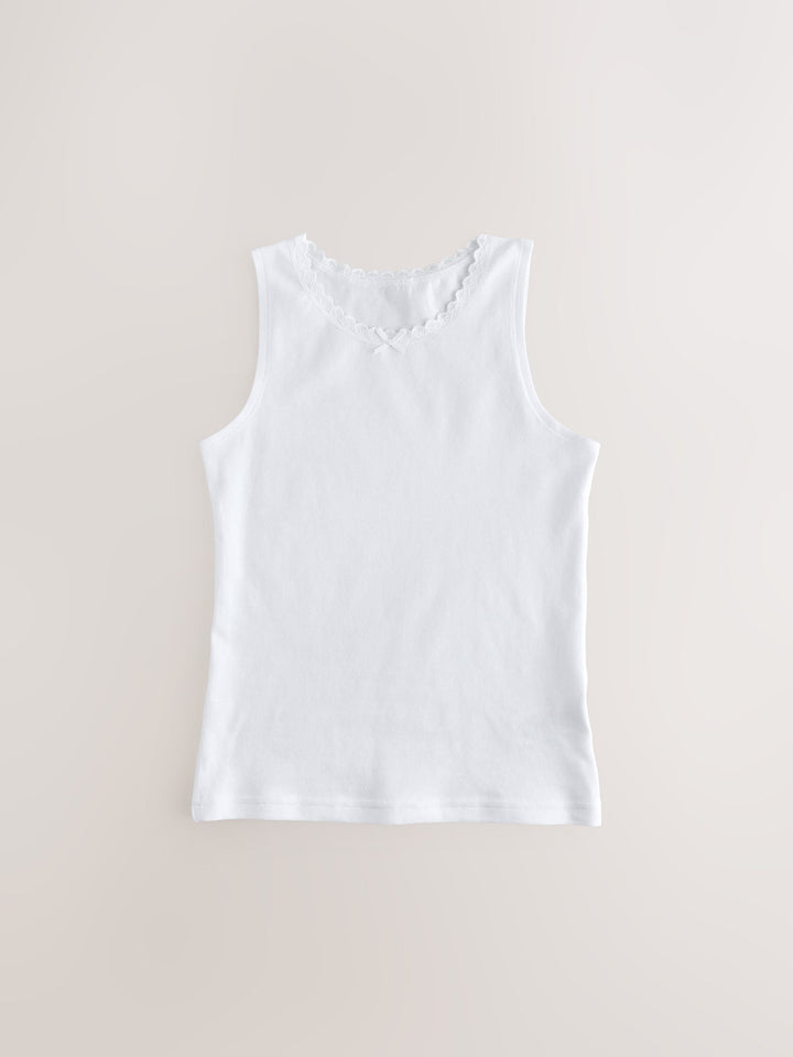 Our 5 pack of white vests are cut in a long length with wide shoulder straps and a high back shape. Complete with lace trim and detailing. 5 pack Cotton rich High back shape Lace detailing Machine washable. 5 x Vest 95% Cotton, 5% LYCRA® XTRA LIFE™ elastane. Country of Origin: Bangladesh LYCRA® XTRA LIFE™ fibre keeps your underwear looking new for longer, with lasting comfort and fit. This innovative stretch fabric is lightweight and breathable and will hold its shape wear after wear, wash after wash.