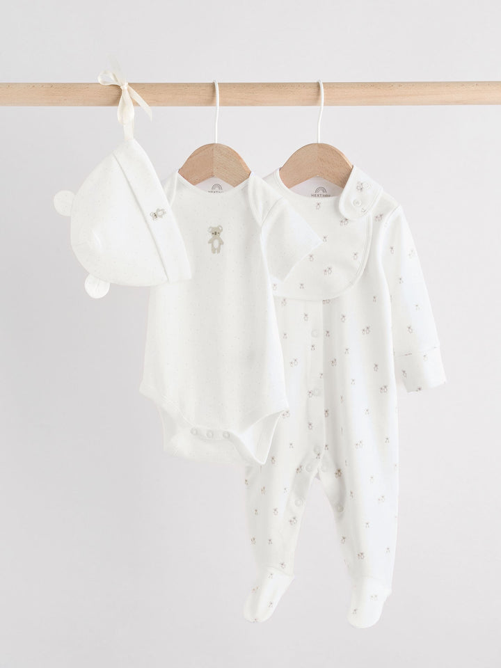 White Baby Sleepsuit, Bodysuit, Beanie and Bib Set 4 Piece (0-9mths)