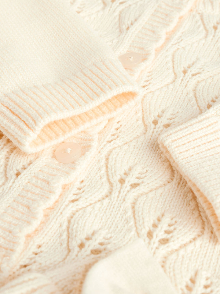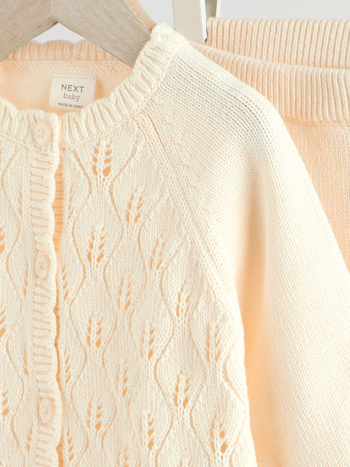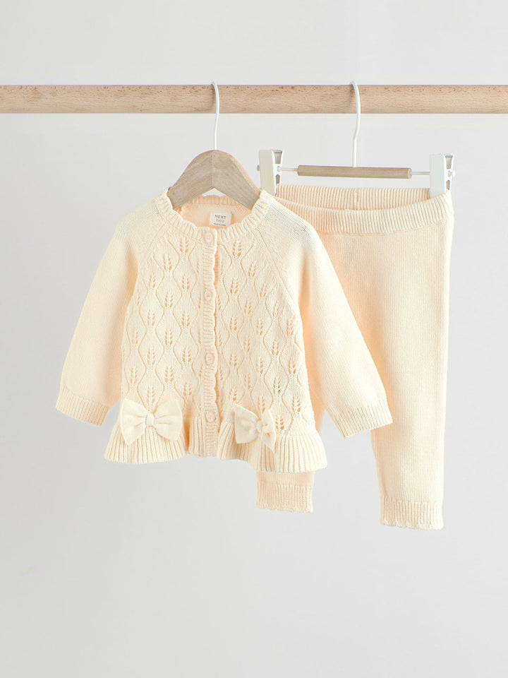 Keep your little one warm and wonderful in our knitted cardigan set. Made from pure cotton with a soft knit finish, this two piece set includes a button-down cardigan with bow detailing and leggings with ribbed hems. 2 piece set 100% cotton Soft knit texture Button-down fastening Bow detailing Machine washable. Cardigan and Leggings 100% Cotton. Country of Origin: China Warning: Keep away from fire and flames.
