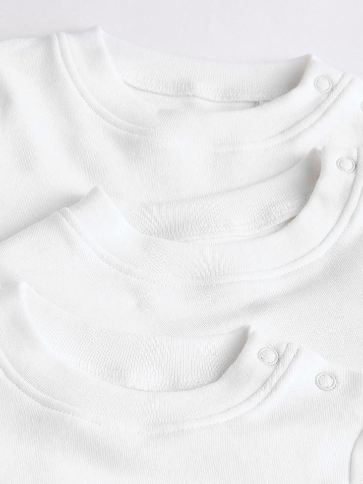 This 3 pack of white long sleeve cotton t-shirts are perfect for adding to the wardrobe. Complete with popper fastening, crew neck and soft jersey feel. 3 pack Long sleeves 100% cotton Popper fastening Crew neckline Machine washable. 3 x T-shirt 100% Cotton. Country of Origin: Bangladesh Warning: Keep away from fire and flames.