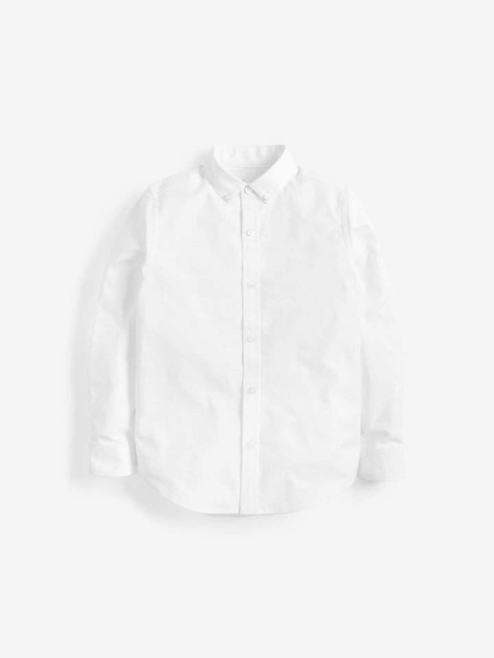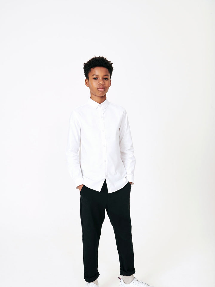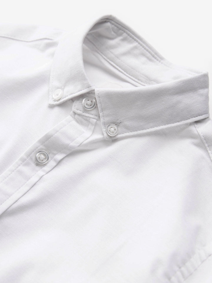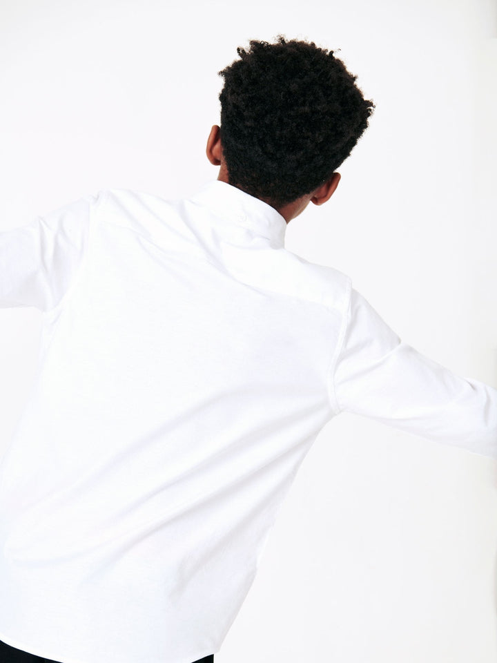 Taking inspiration from our menswear collection, this shirt in white plain is made with a cotton-rich construction and elastane for comfort. The button-up fastening leads to a smart button-through collar finished with an embroidered chest logo. Long sleeve Slight stretch Button-up fastening Button-through collar Machine washable. 98% Cotton, 2% Elastane. Country of Origin: Bangladesh