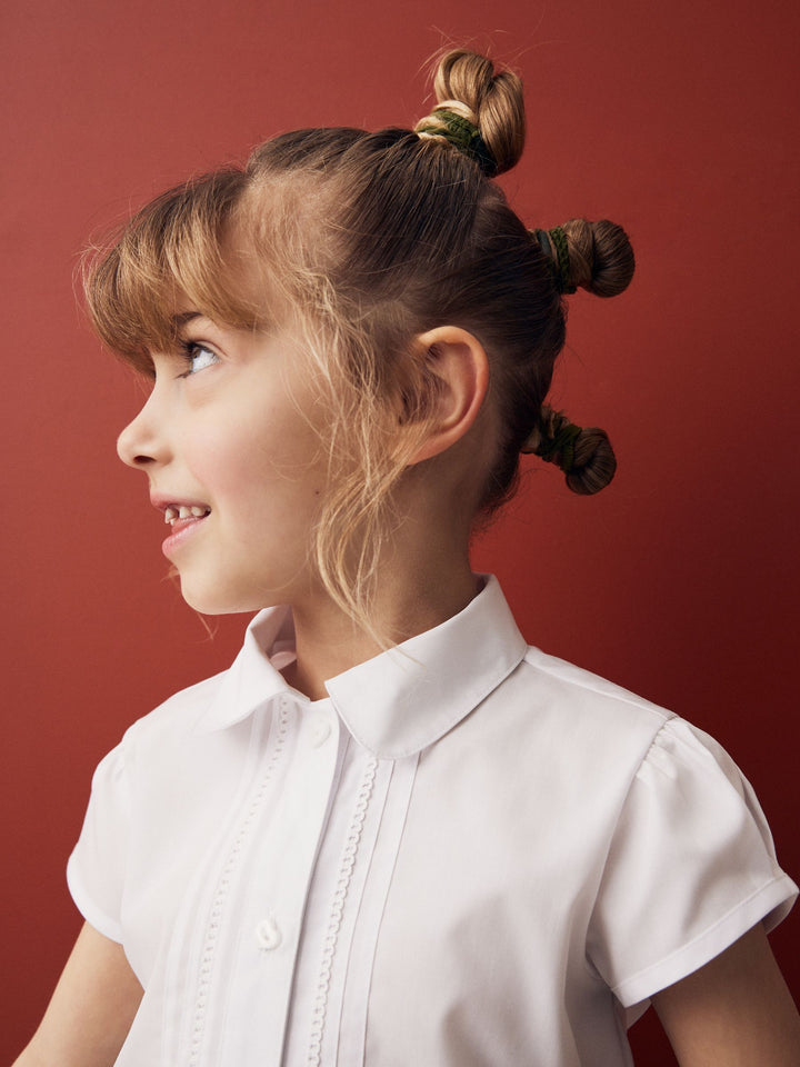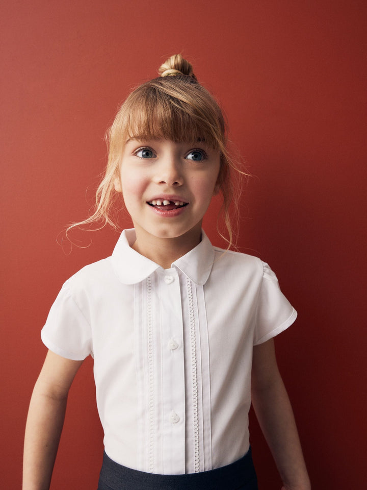 We've taken the traditional white school shirt and given it an update, with lace detail on the placket, chunky heart-shaped buttons, capped sleeves to help keep them cool during summer months, and a rounded collar for a smart look.Key Features: Easy Iron Fabric - Handy easy-iron finish Pro White - Pro white finish which keeps whites whiter for longer Machine washable Regular fit Short cap sleeves Lace detailing Machine washable. 65% Recycled polyester, 35% Cotton. Country of Origin: Bangladesh