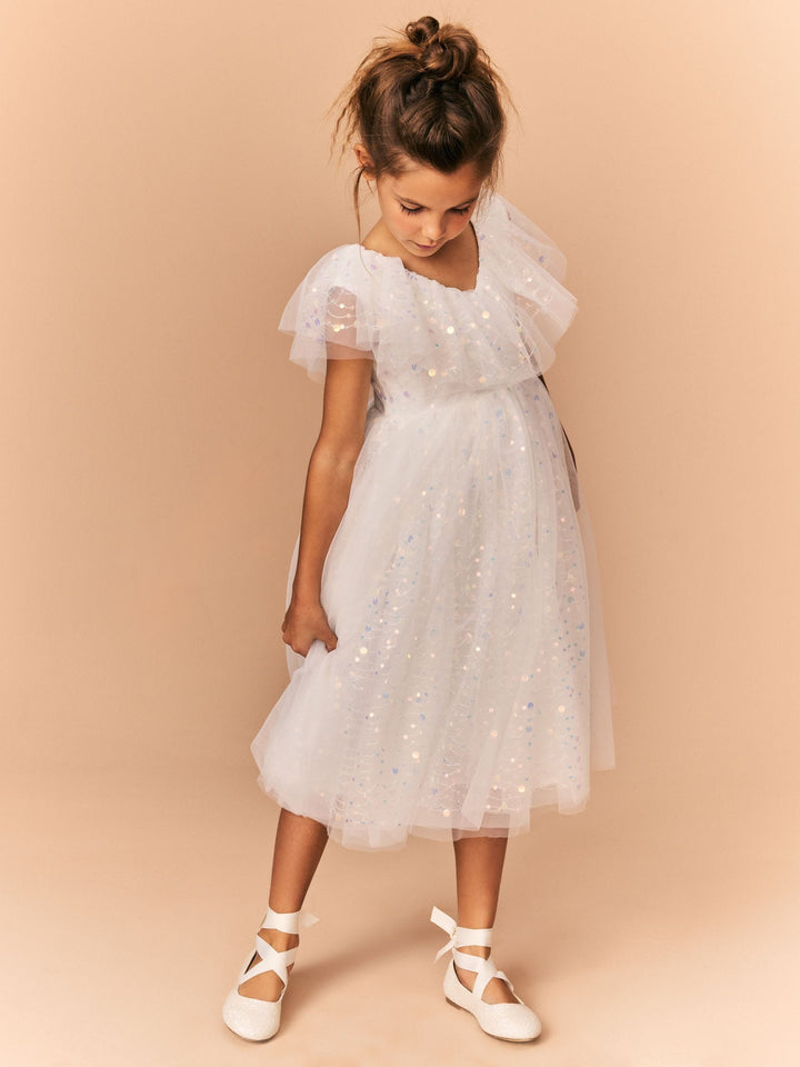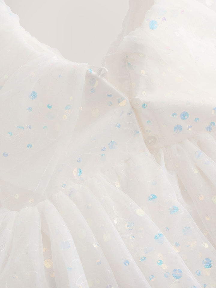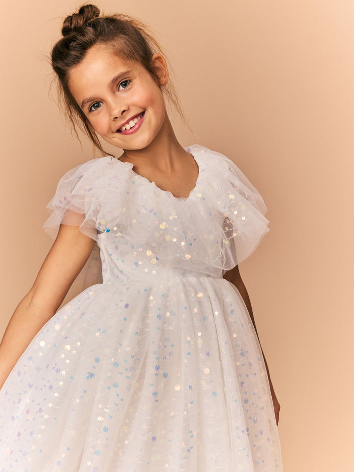 Whether it's for weddings, family get-togethers or parties, this beautiful white dress is ideal for any special occasion. The dress has a soft mesh fabric with a comfortable cotton lining, featuring ruffle and sequin detailing, finished with a button fastening to the back. Mesh fabric Cotton lining Ruffle and sequin detailing Button fastening to the back Main 100% Nylon. Mesh 100% Nylon. Lining 100% Cotton. Country of Origin: China